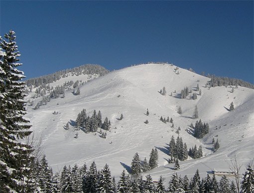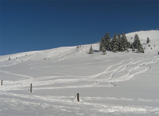 Direkt vom Parkplatz über die schönen, immer gleich steilen Hänge zum höchsten Punkt. Meist schon Spuren vorhanden - da sehr beliebt.
