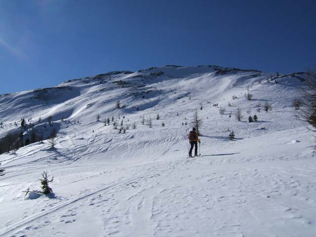 Von der Strasse über die freien Wiesen zur kleinen Häusergruppe Raut. Von hier dem breiten Sommerweg durch den Wald folgend, am Schwendereck vorbei zu den Lichtungen der Gossenwiesen. Weiter durch schütteren Wald an mehreren Alm- bzw. Jagdhütten vorbei zur Baumgrenze. Über die freien Wiesen der Rauter Alm unter den steilen Gipfelhang. Dieser wird links (östlich) umgangen. Zuletzt wieder flacher über den breiten Rücken zum Gipfel.