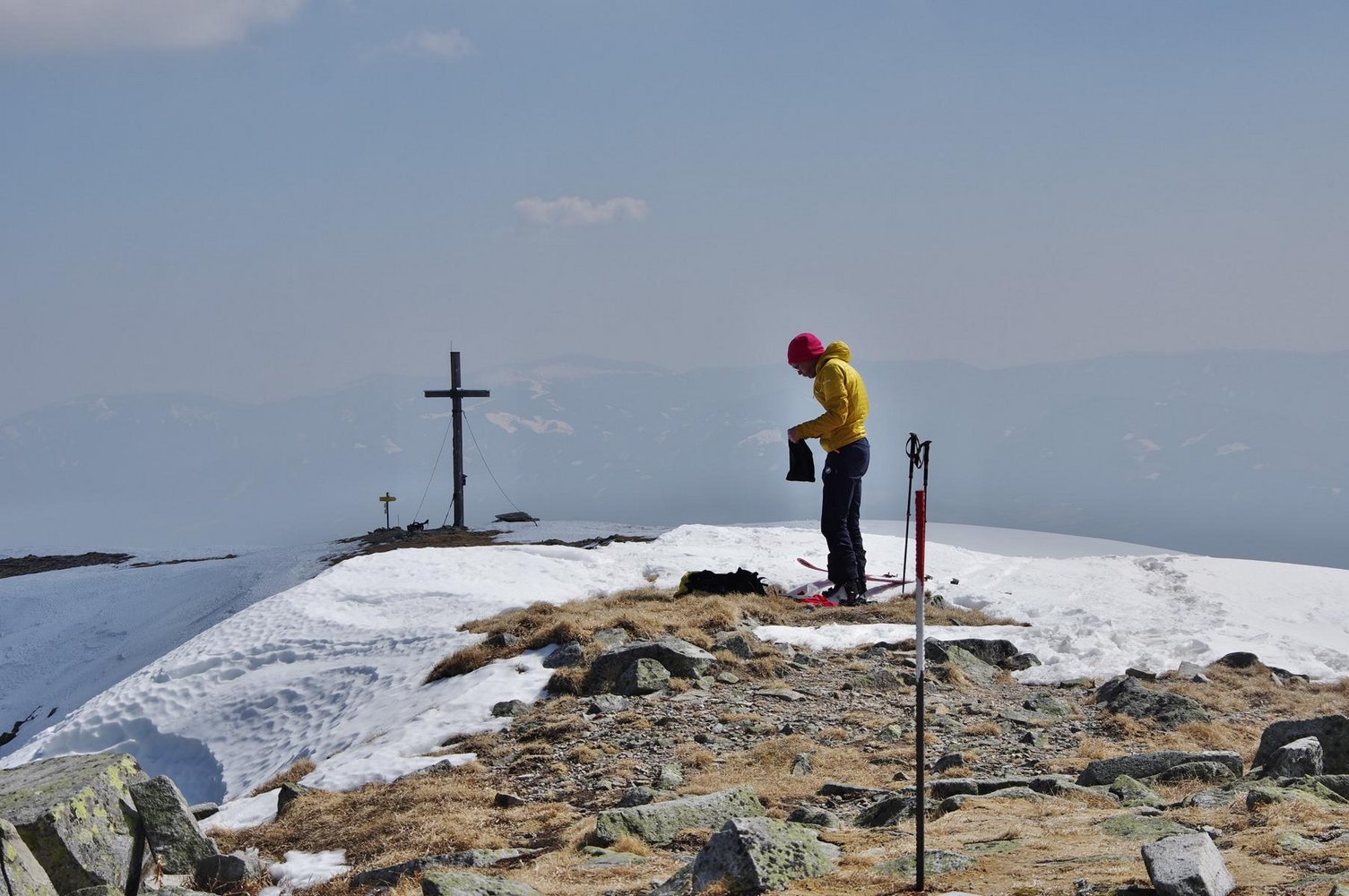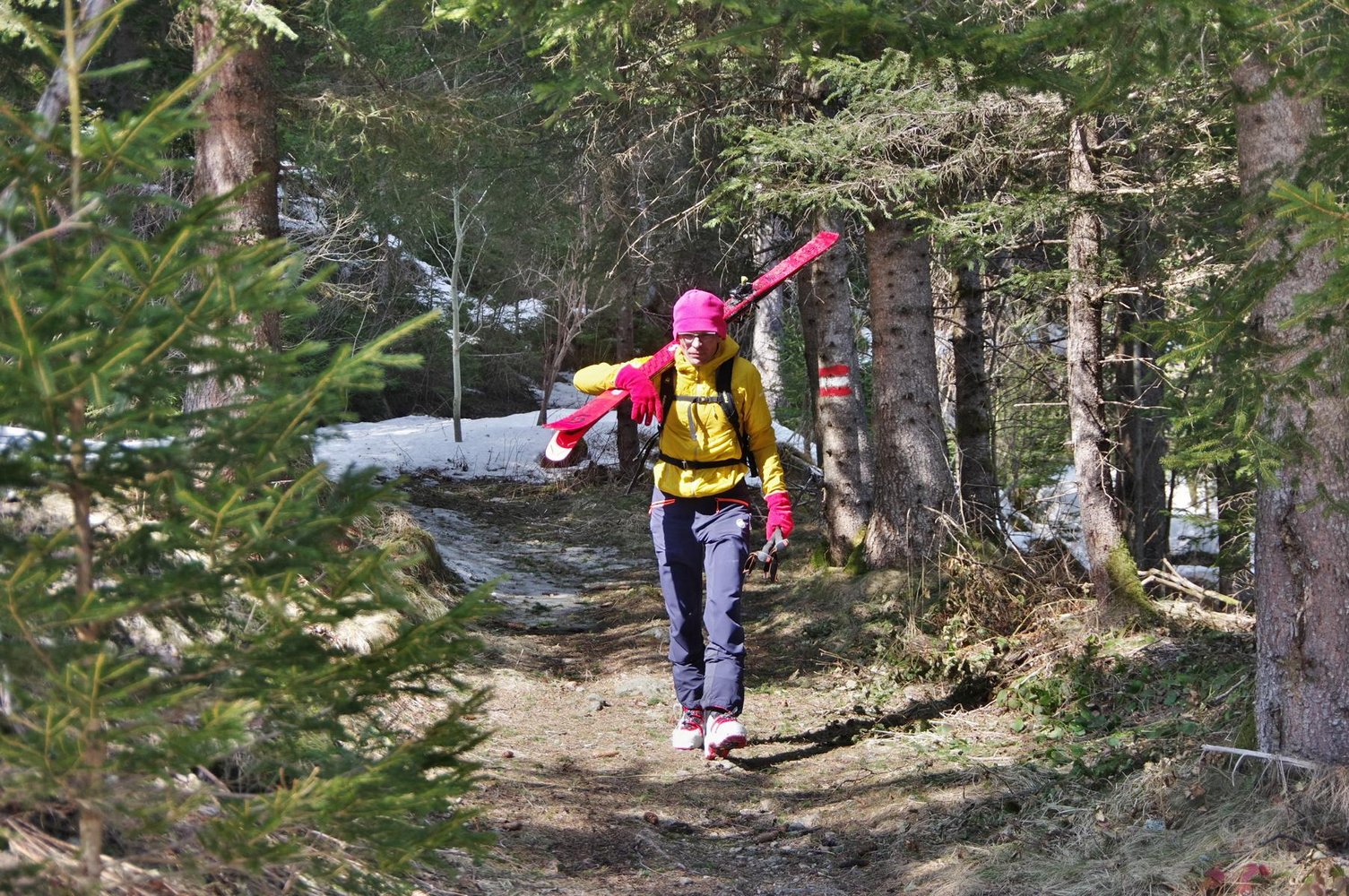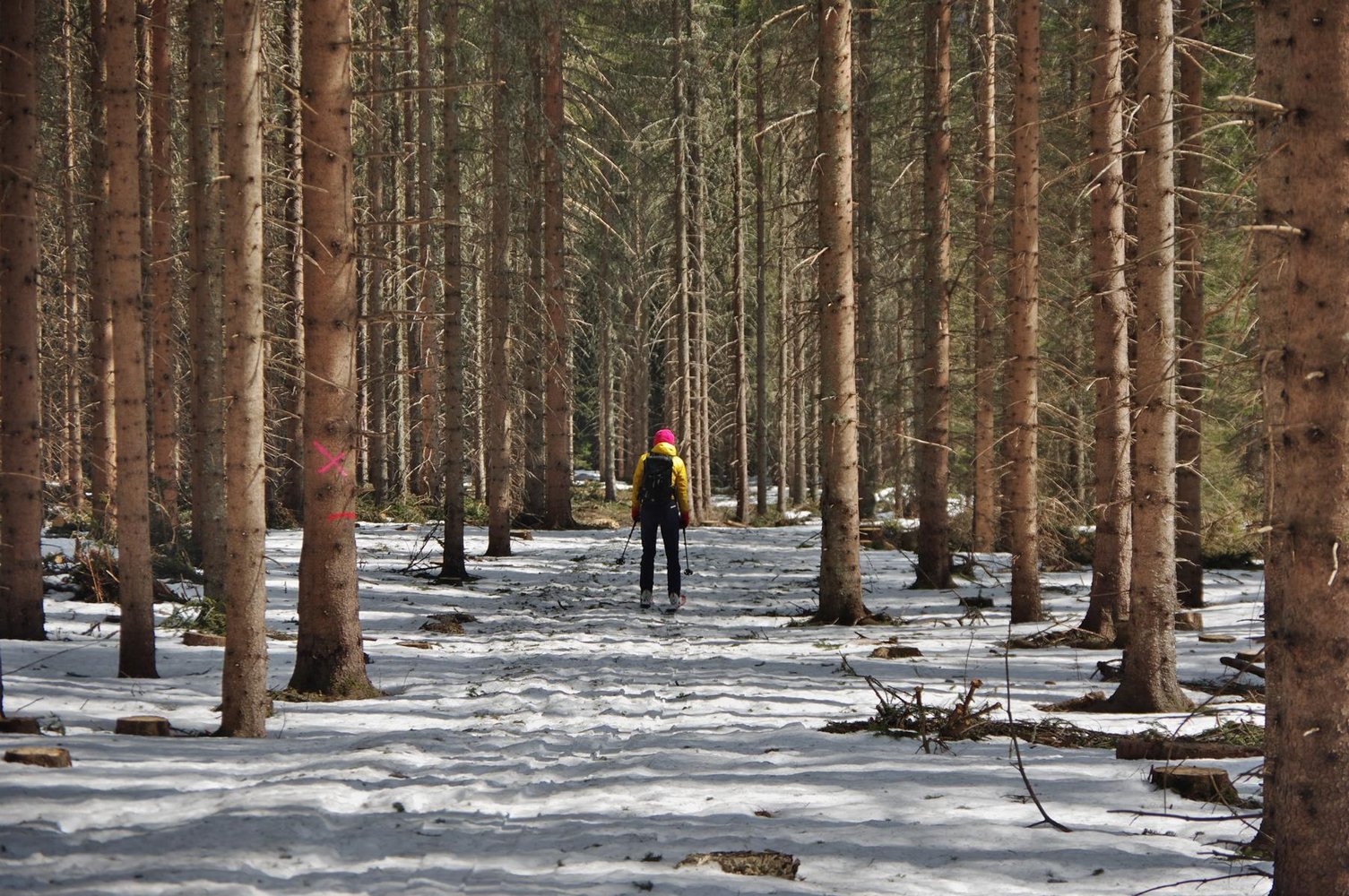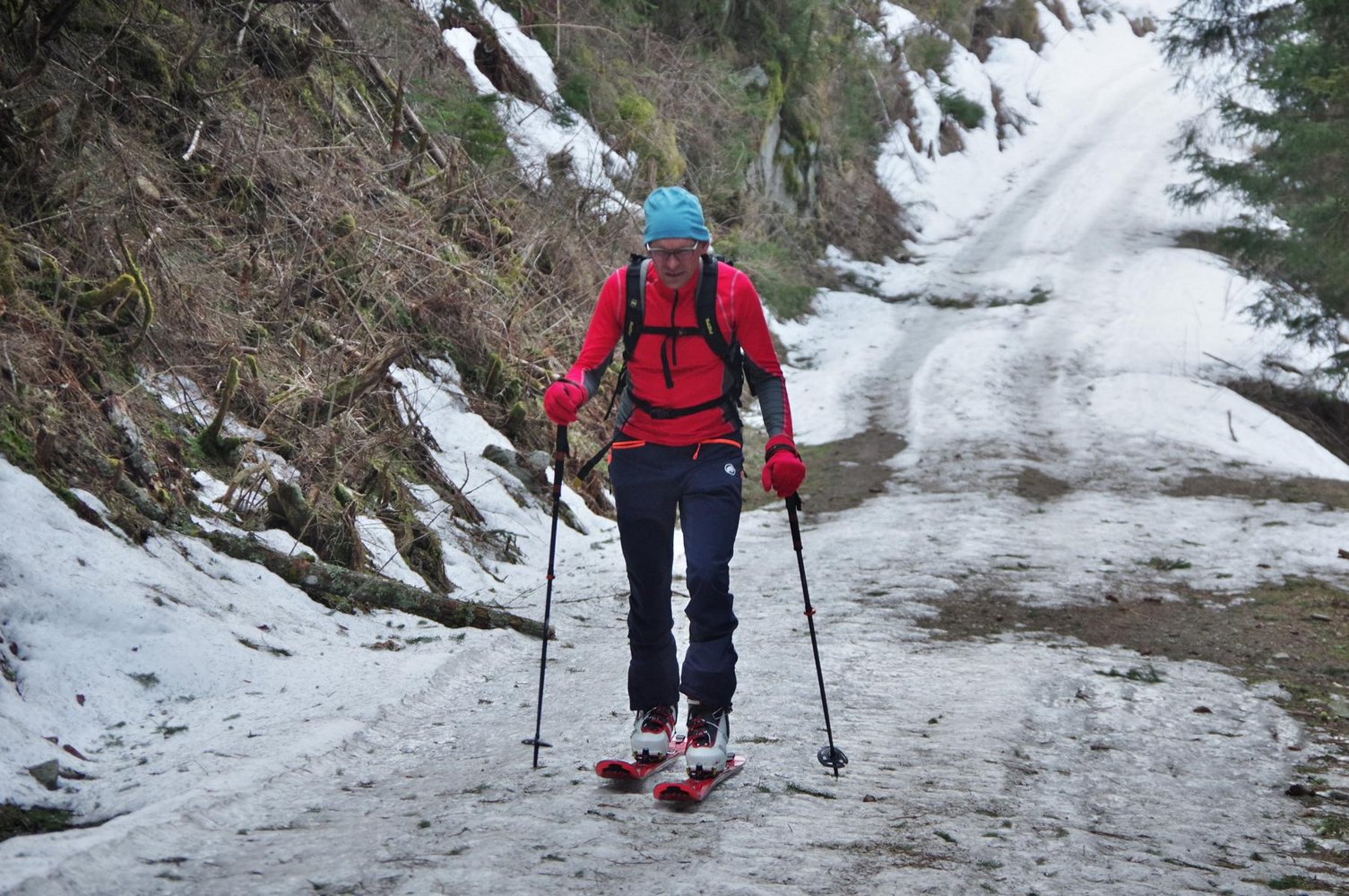 Man folgt dem Forstweg gerade in den Graben und bleibt immer auf dem Wanderweg. Auf ca, 1400m verlässt man den Wanderweg und folgt der Wintermarkierung am Forstweg zur St. Bernhardi Hütte. Dann einem Ziehweg bis auf 1600m hinauf und erreicht. Hier hat man die Südrinne (Bach) erreicht und folgt dieser auf der linken Bachseite unter einer kleinen Hütte vorbei bis unter und je mach Verhältnissen rechts oder links hinauf zum Gipfel.