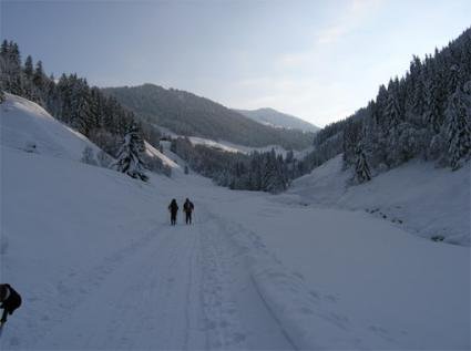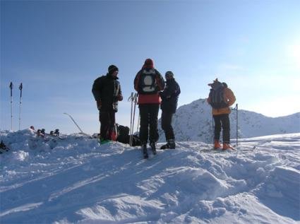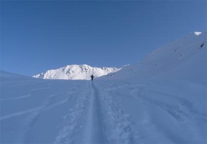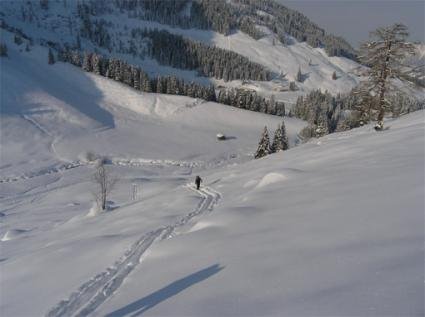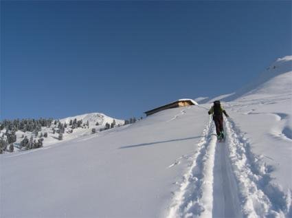 Im steilen Gipfelhang (nördlich ausgerichtet) sollten die Schneeverhältnisse passen (Lawinen).