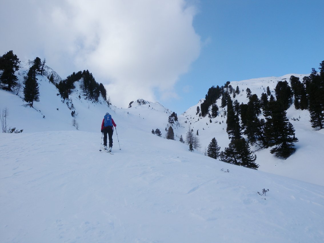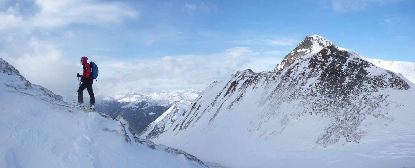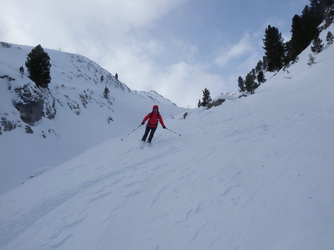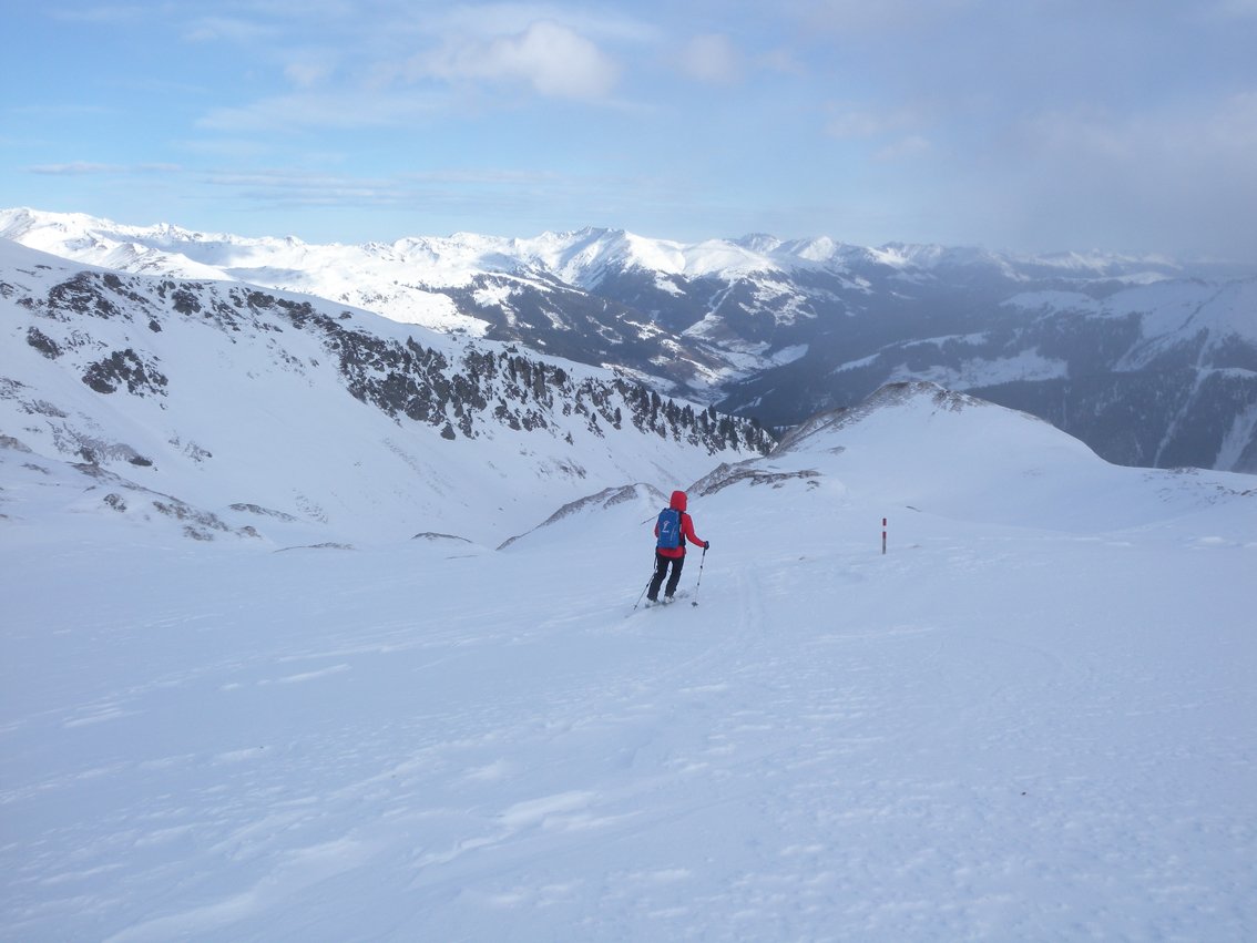 Die Hänge sind etwas flacher als beim Torhelm. Bei sehr unsicheren Schneeverhältnissen ist man in dem teilweise engen Graben vor dem Gipfel aber nicht wirklich sicher (steile Flanken auf der nördlichen Grabenseite).