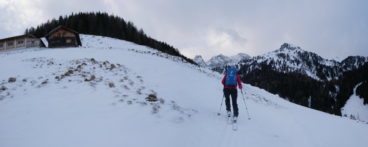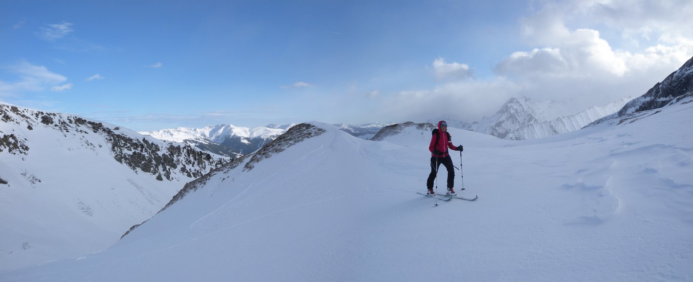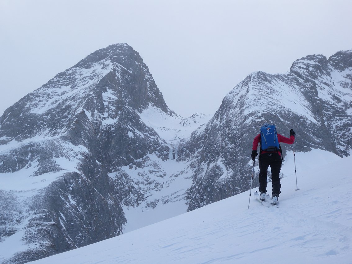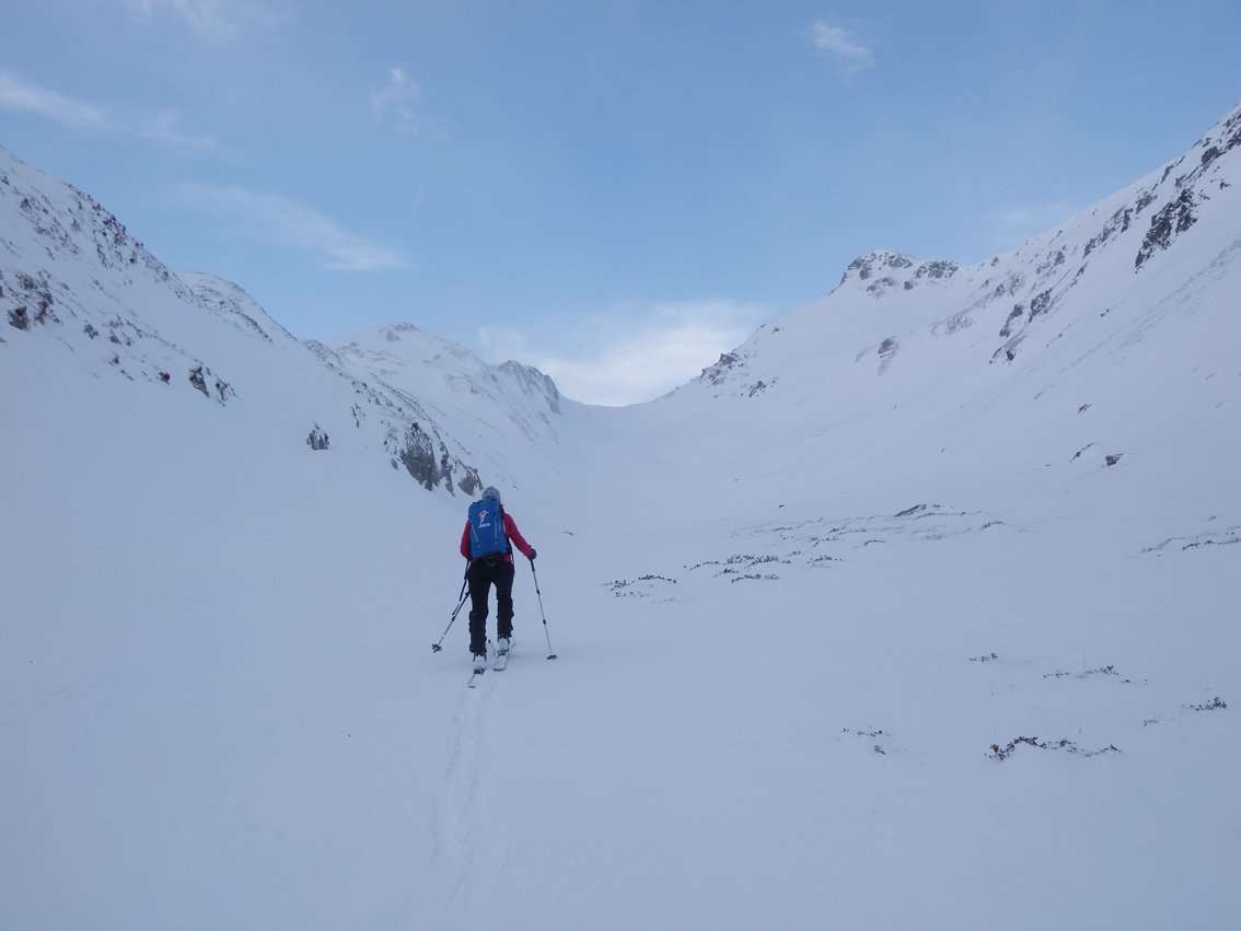 Die Hänge sind etwas flacher als beim Torhelm. Bei sehr unsicheren Schneeverhältnissen ist man in dem teilweise engen Graben vor dem Gipfel aber nicht wirklich sicher (steile Flanken auf der nördlichen Grabenseite).