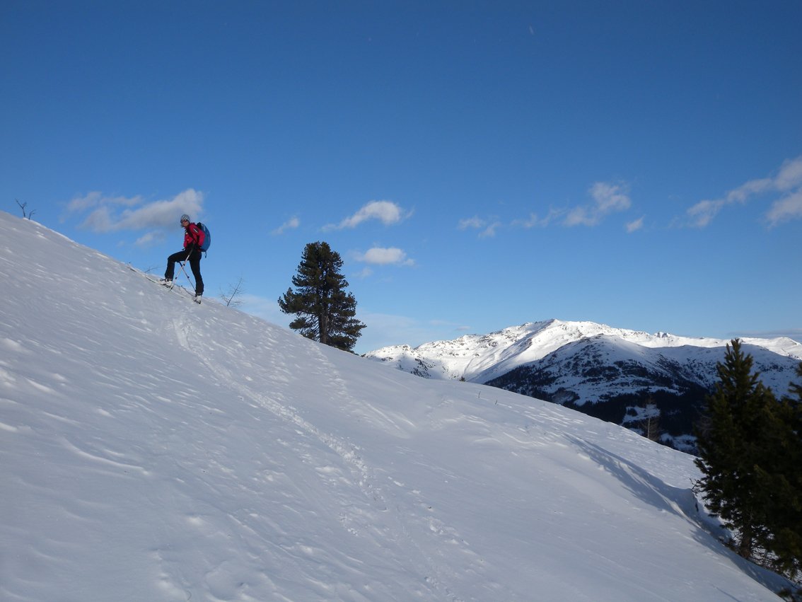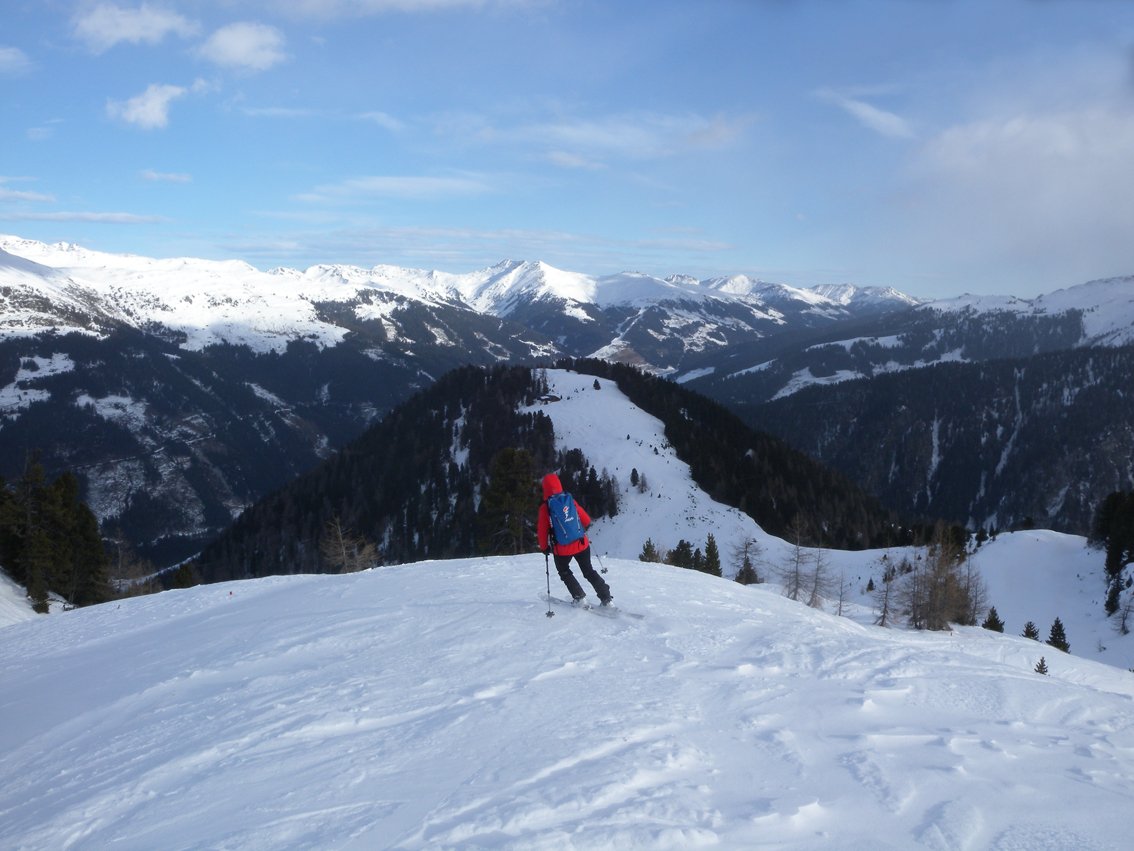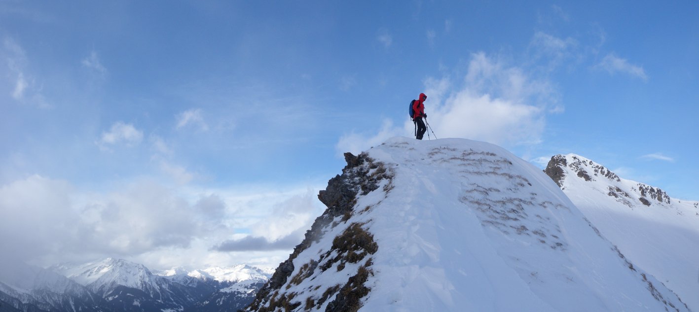 Die Seespitze steht etwas im Schatten des von Tourengehern in der Regel gestürmten Torhelms - und das nicht nur weil sie um ca. 100 m niedriger und genau dahinter steht. Der Anstieg ist aber durchaus lohnend und ein wenig leichter als der Weg zum Torhelm. Wer schon mal dort ist, kann auch gleich eine Kuppe beim Brandenberger Joch (Kuppe mit Stange) mitbesteigen, der Mehraufwand von ca. 5 Minuten hält sich in Grenzen. Weil die Seespitze etwas niedriger und geschützter ist, hält sich oft mehr Schnee als auf dem Gipfelkamm des Torhelms.