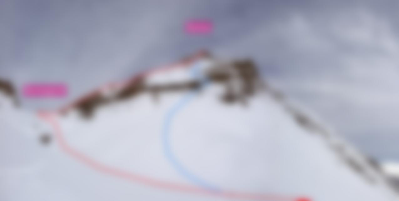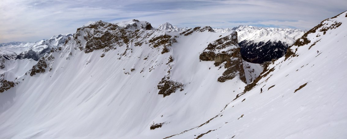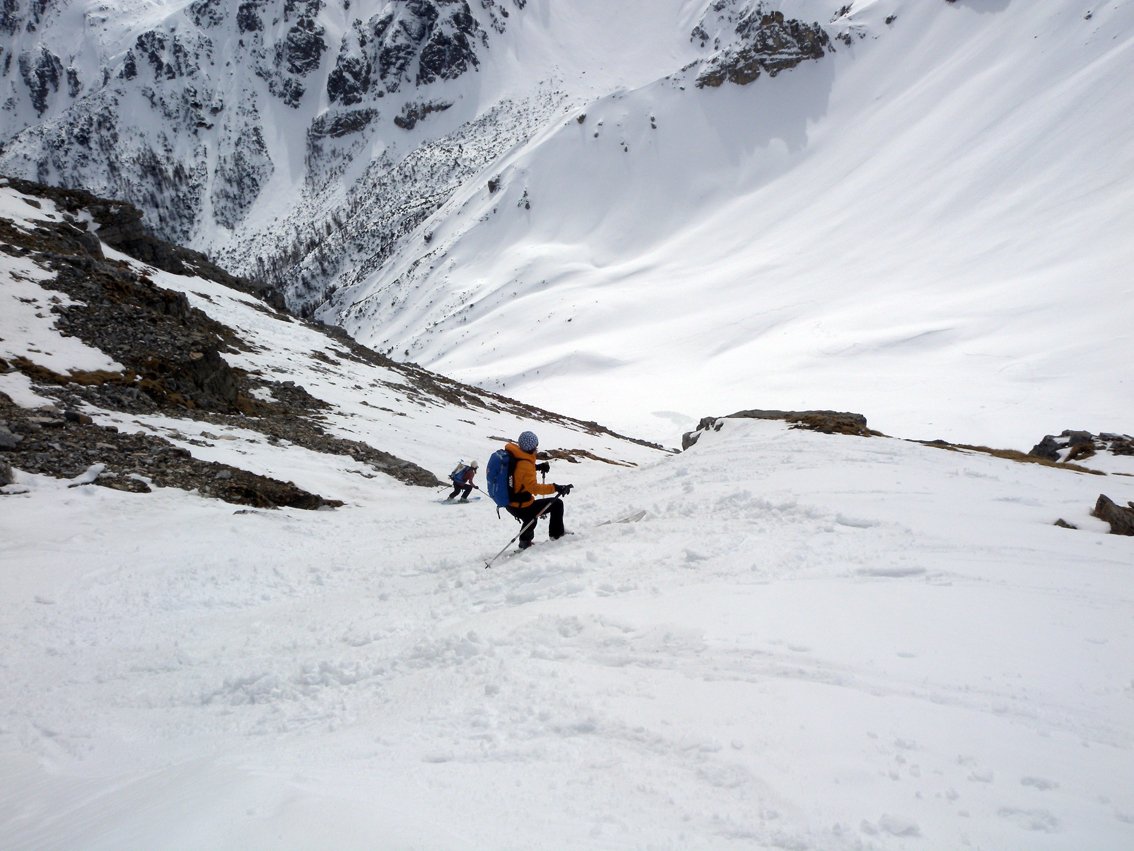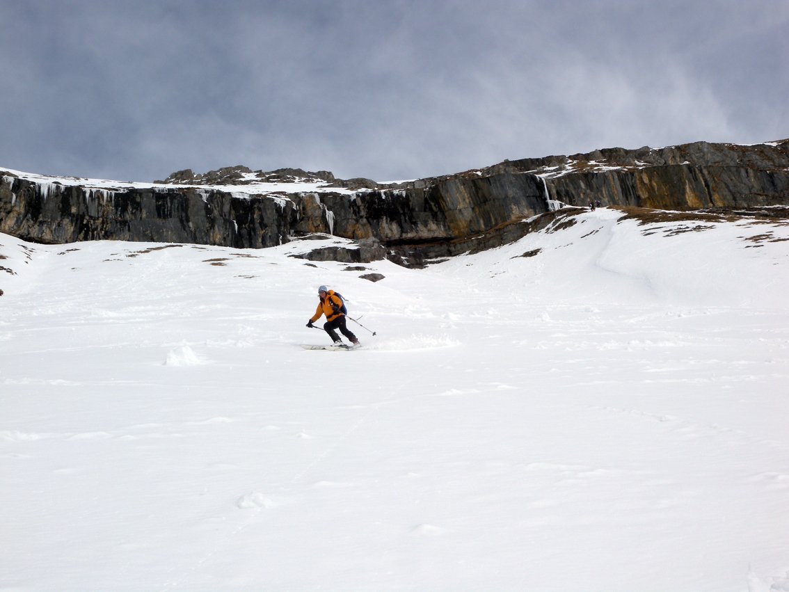 Direkte Abfahrt: Wer direkt abfahren möchte fährt auf dem großen Firnhang links haltend ab, um zu einer Rinne zu gelangen, welche den Felsgürtel durchbricht. In dieser Rinne kurz abwärts, dann aber sofort nach rechts queren (unten gibt es noch einen Abbruch!) und über schöne Hänge hinauf zur Aufstiegsspur und weiter ins Tal. Anm.: Man schaut sich die Abfahrtsmöglichkeit am besten beim Aufstieg genau an (siehe auch Übersichtsbild).