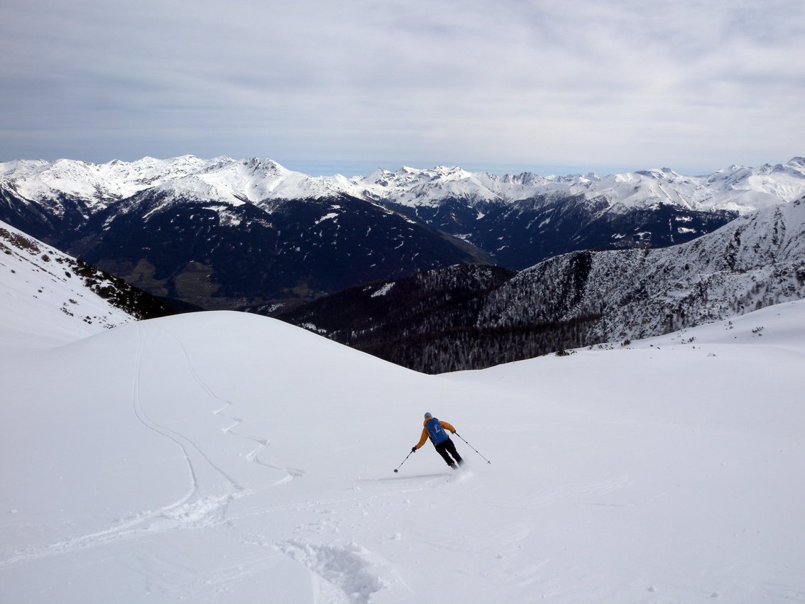 Für die direkte Abfahrt vom Gipfel ist etwas Gespür für die richtige Linie nötig (oft sind aber schon Spuren vorhanden). Bei sehr guten Schneeverhältnissen ist die direkte Abfahrt nicht sehr anspruchsvoll (nicht viel steiler als die letzten Meter vor dem Serlesjöchl) - die richtige Linie durch den Felsgürtel muss man aber finden!