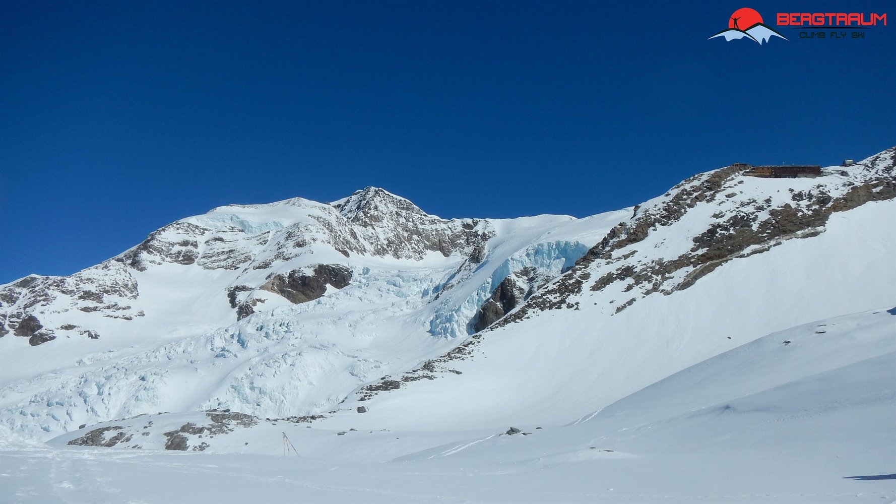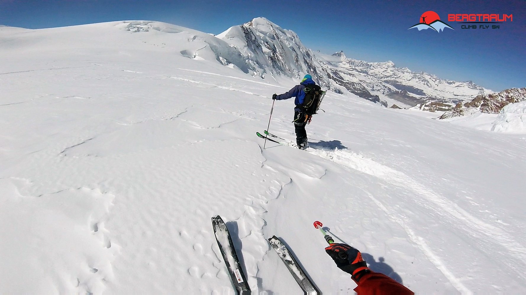 Abstieg und kurze Querung Richtung Westen und über den Lysgletscher weiter bis zum Lysjoch auf 4.151 m. Kurze Abfahrt auf den Grenzgletscher und Wiederaufstieg in einem großen Rechtsbogen zum colle Gnifetti (4.420 m). Dort kurz steil zum Gipfel bzw. dem Rifugio Regina Margerita hinauf. Vom Gipfel in nordwestliche Richtung wieder runter zum colle Gnifetti. Dort Schidepot und neuerlicher kurzer Aufstieg auf den Gipfel der Zumsteinspitze (4.563 m). Zurück wie Aufstieg. Finale Abfahrt über den sehr spaltenreichen Grenzgletscher zur Monte Rosa Hütte (2.883 m)