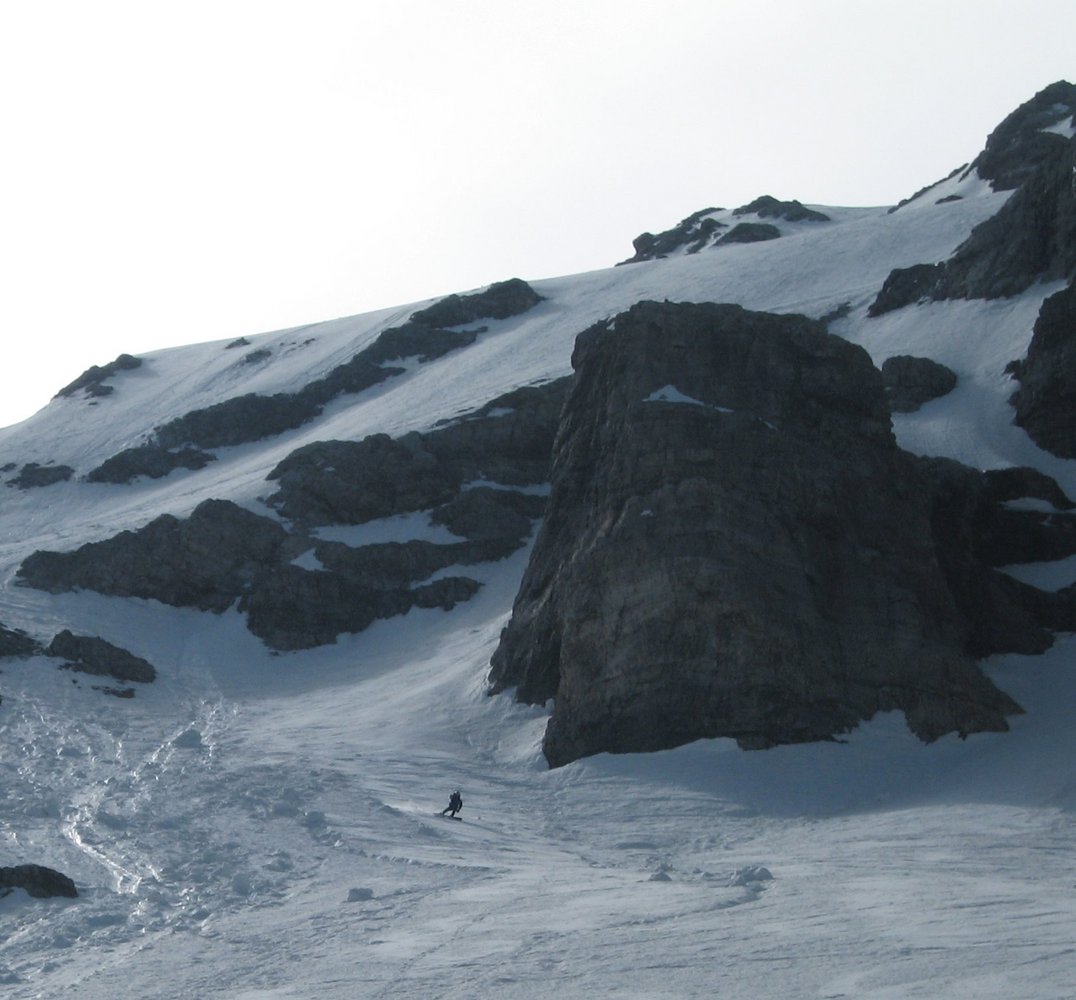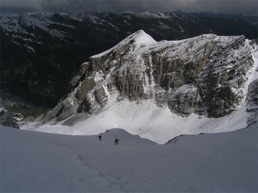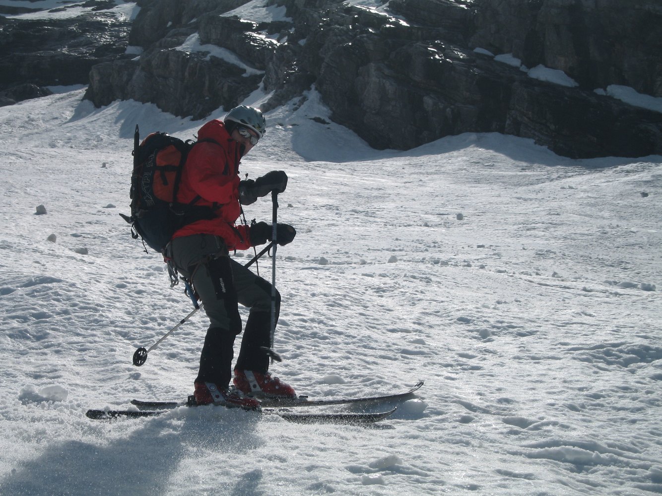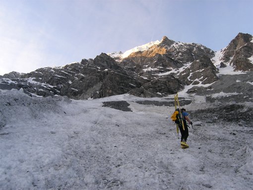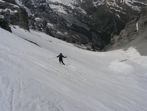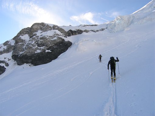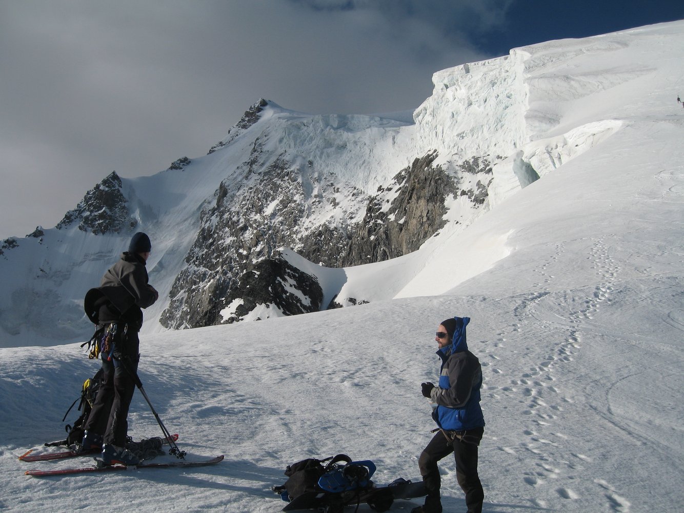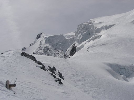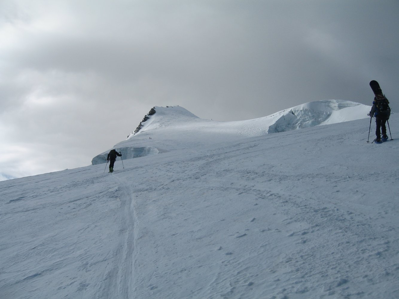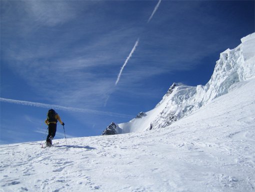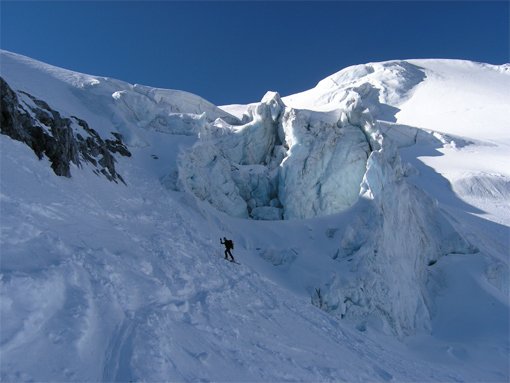 Bei der Abfahrt teilweise tückischer Wechsel zwischen Eis und Schnee (je nach Verhältnissen; Gletschergelände).
