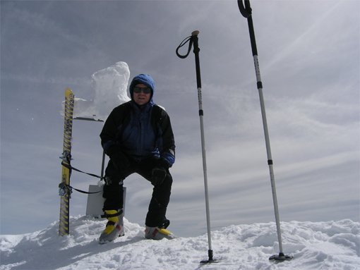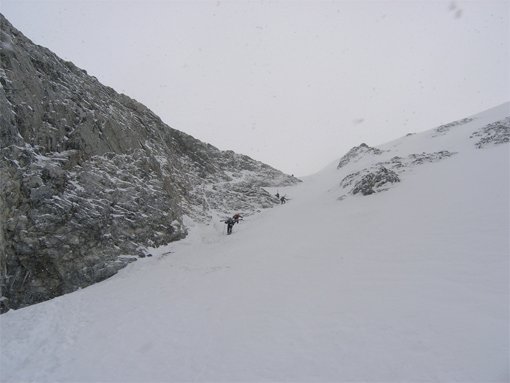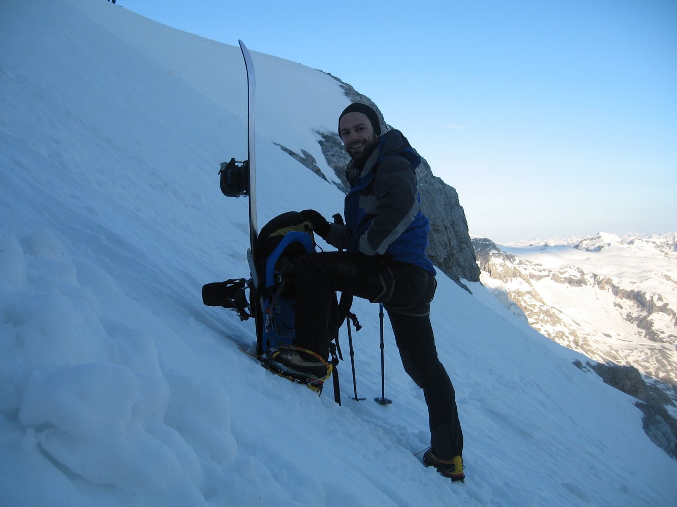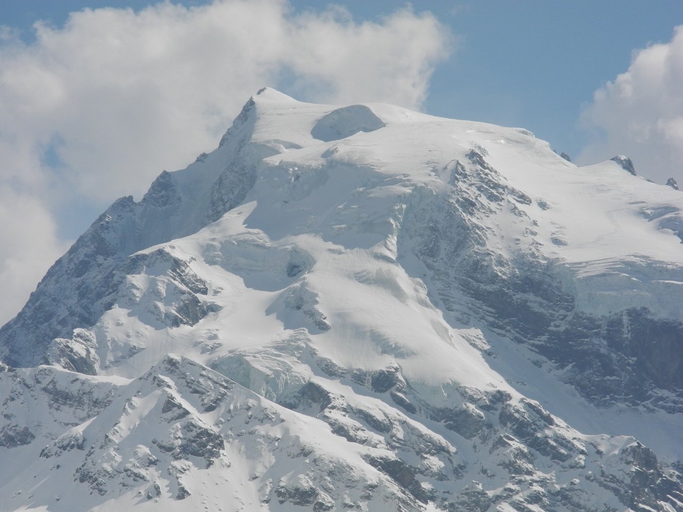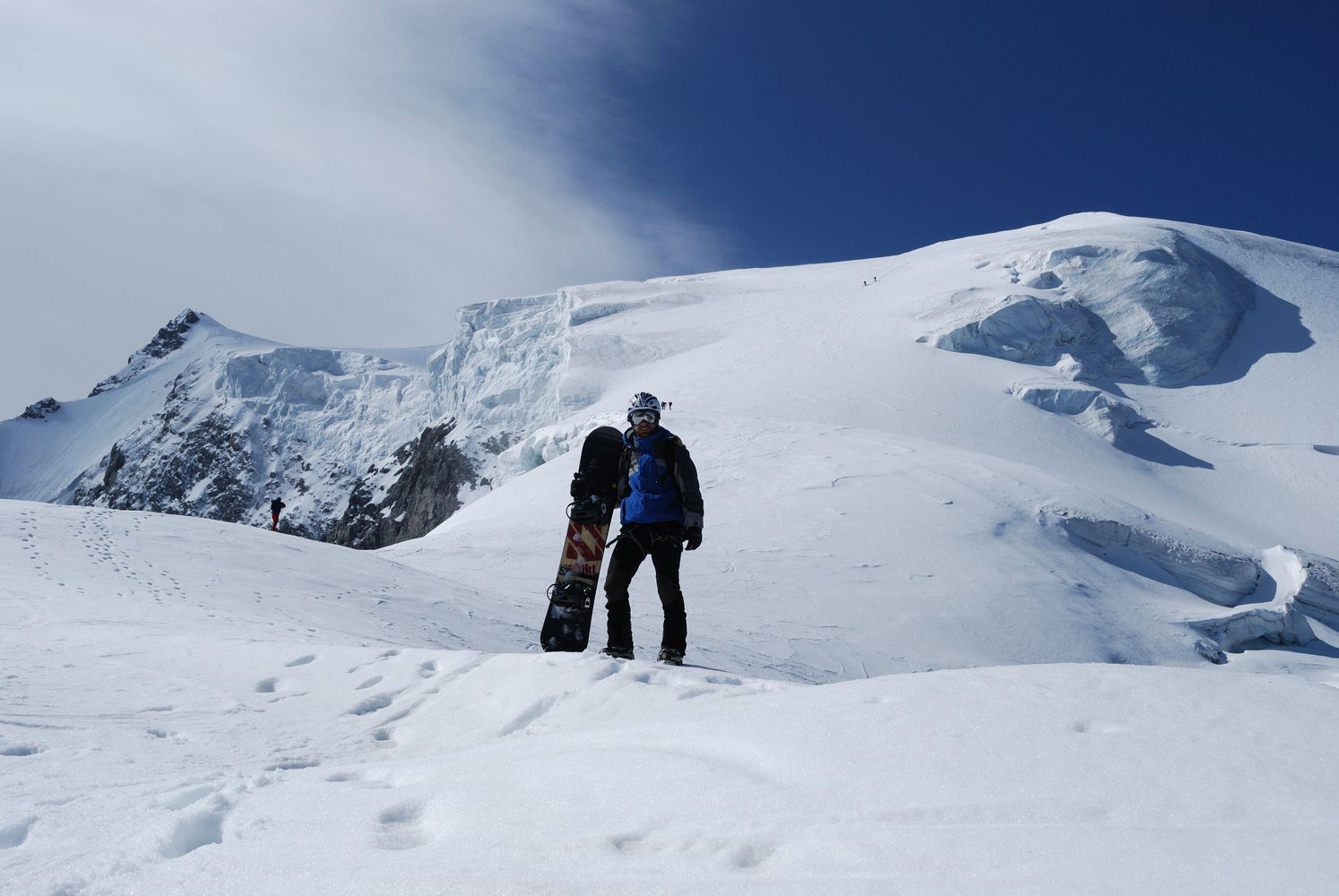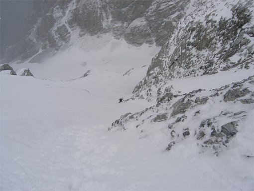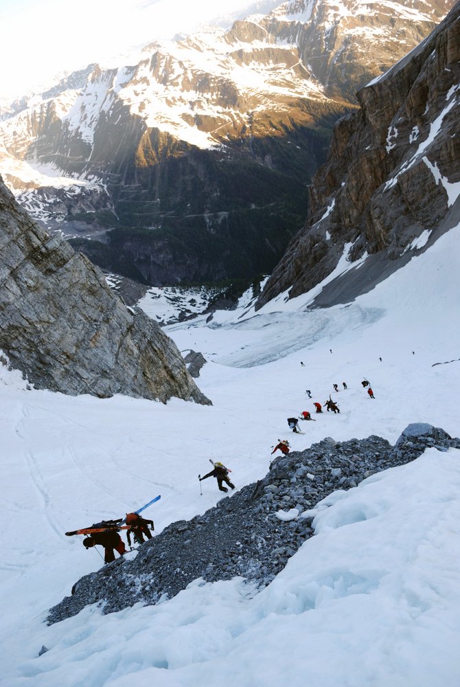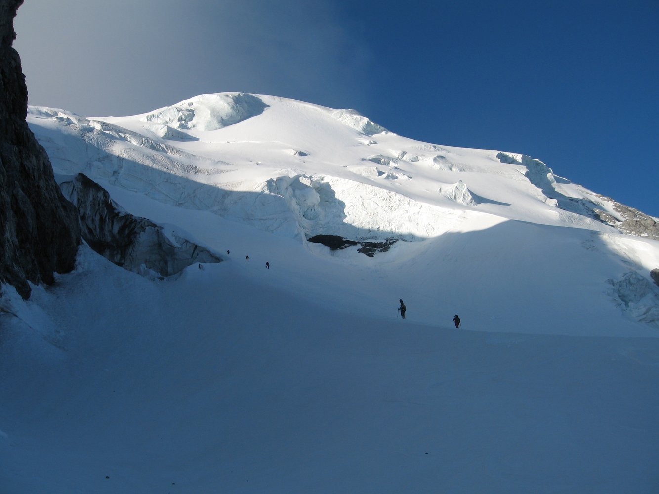 Bei der Abfahrt teilweise tückischer Wechsel zwischen Eis und Schnee (je nach Verhältnissen; Gletschergelände).