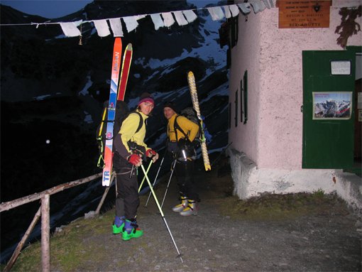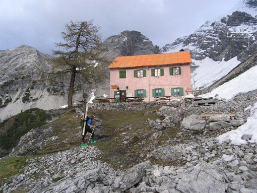 Den Ortler als Schitour, ja geht denn das? Ja, es geht und wird von guten Südtiroler-Skitourengehern schon seit einigen Jahren zum Saisonabschluss gemacht. Die Tour gehört mit ihren 2300 Hm (von der Hütte immer noch satte 1700 Hm) zu den ganz großen Skizielen in den Ostalpen. Bei guten Verhältnissen kommt man sogar ohne Schiabschnallen auf den Gipfel, meist muss man aber im Bereich der 45° steilen „Trafoier Eisrinne“ mit Steigeisen aufsteigen. Die Querung unter den riesigen Gletscherbrüchen lässt bei vielen ein mulmiges Gefühl aufkommen, und setzt dem ohnehin schon sehr hohen Gesamtanspruch dieser Schitour noch eine drauf! Seit dem die urige Berglhütte im Frühsommer offen ist (nur an schönen Wochenenden bewirtschaftet), kann bei einer Nächtigung auf der Hütte die anschließende Tagesettape um 600 Hm verkürzt werden – dies ist bei einer Zielhöhe von fast 4000 m auch anzuraten!