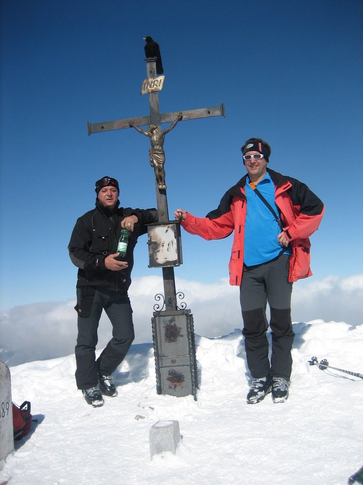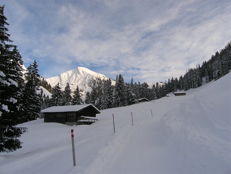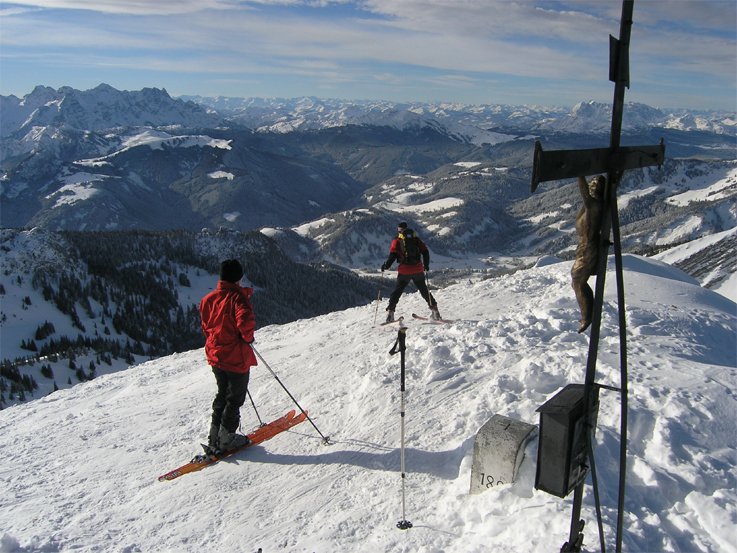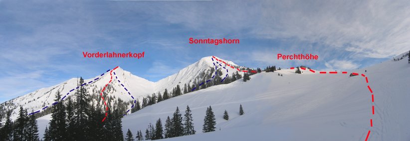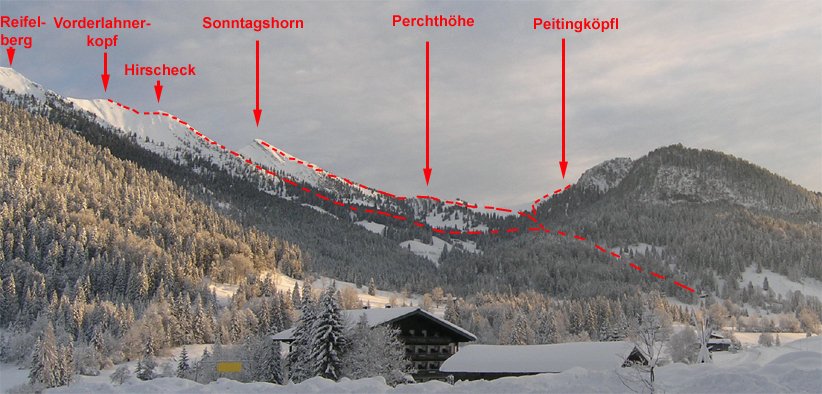 Gleich hinter dem Bauern rechts über freie Hänge bzw. Waldstücke auf einer Forststraße die zur Gschendteralm führt. An der Alm vorbei, bevor die Forststraße zur Hochalm leicht abfällt rechts über Wiesen weiter zur Perchthöhe (1767 m), die sich zwischen Peitingköpfel und Sonntagshorn befindet. Nördlich weiter am Kamm - ganz kurz abfahren - und über den breiten Hang zum Gipfelkreuz aufsteigen.
