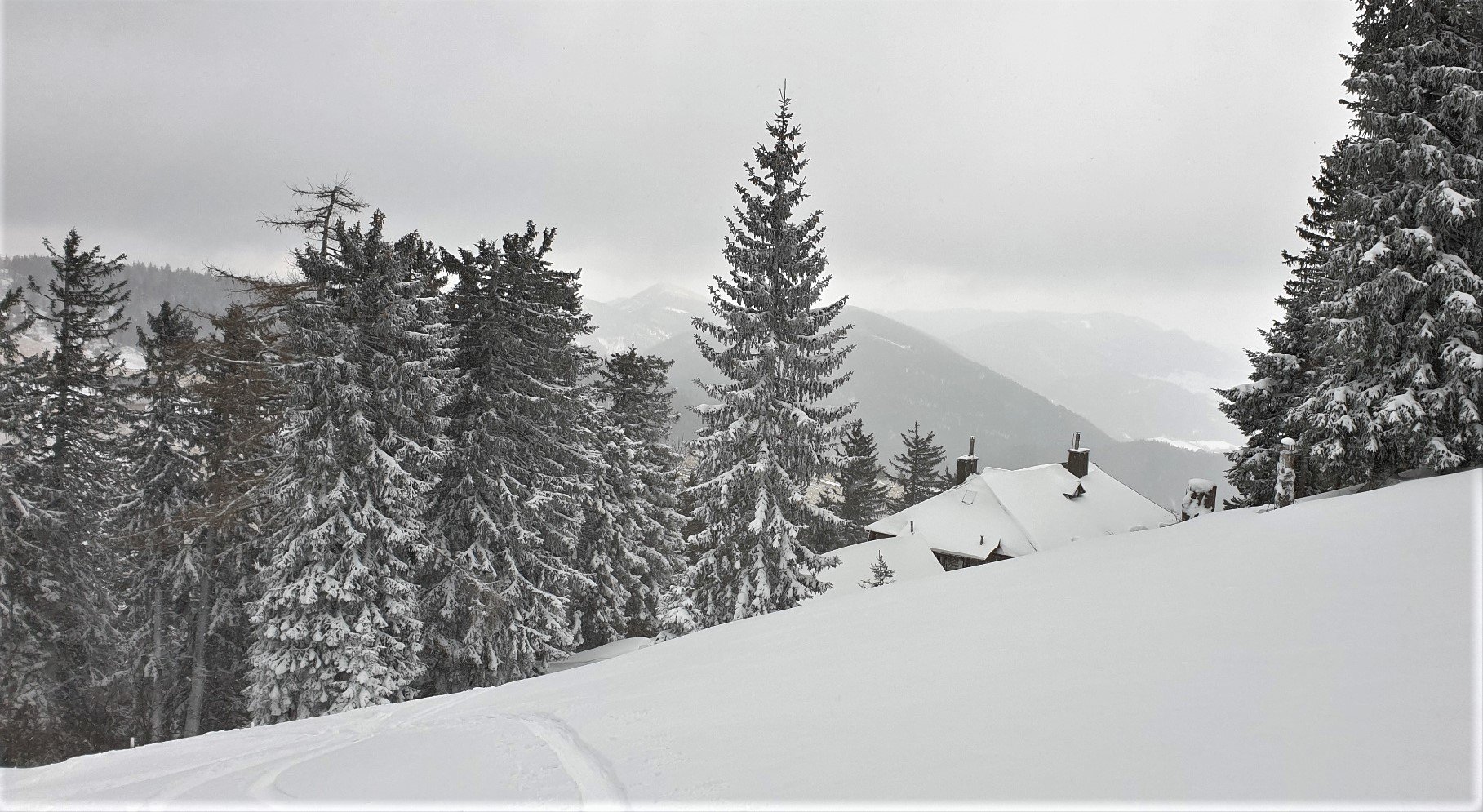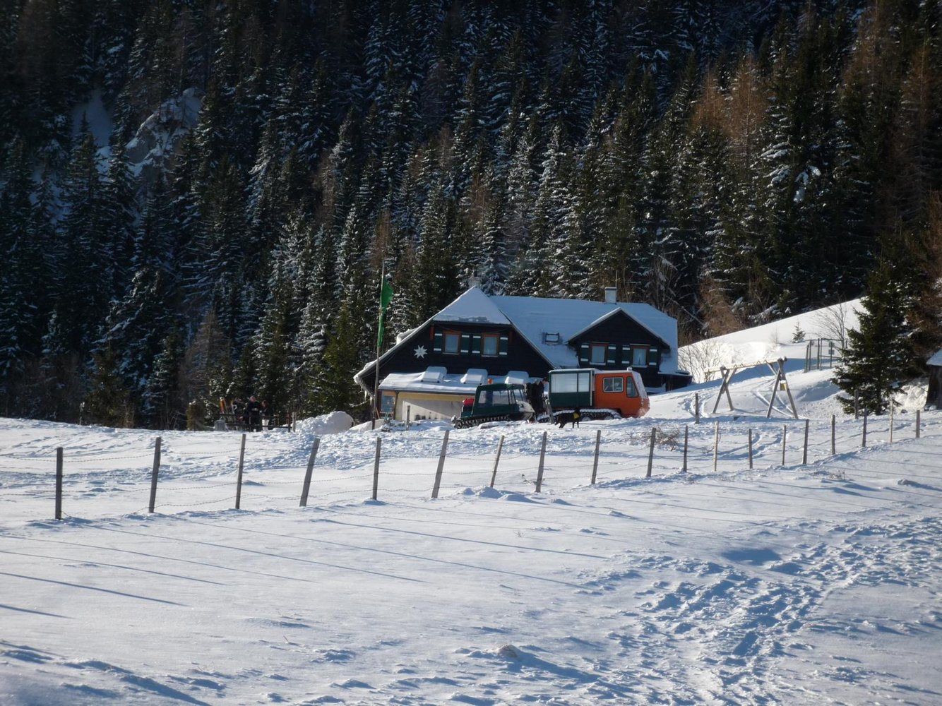Wenn's am Schneeberg wieder mal voll stürmt und schneit, sind für den Ottonormalverbraucher die Touren zum Gipfel tabu. Wer sich dennoch etwas bewegen möchte, oder bei Schönwetter auch erstmals eine Skitour versuchen möchte, der steigt über die Lahning Piste zur Sparbacher Hütte auf und geht danhinter noch gute 50 Hm Richtung Fadendreieck bis zu einer markanten Forsttraße.