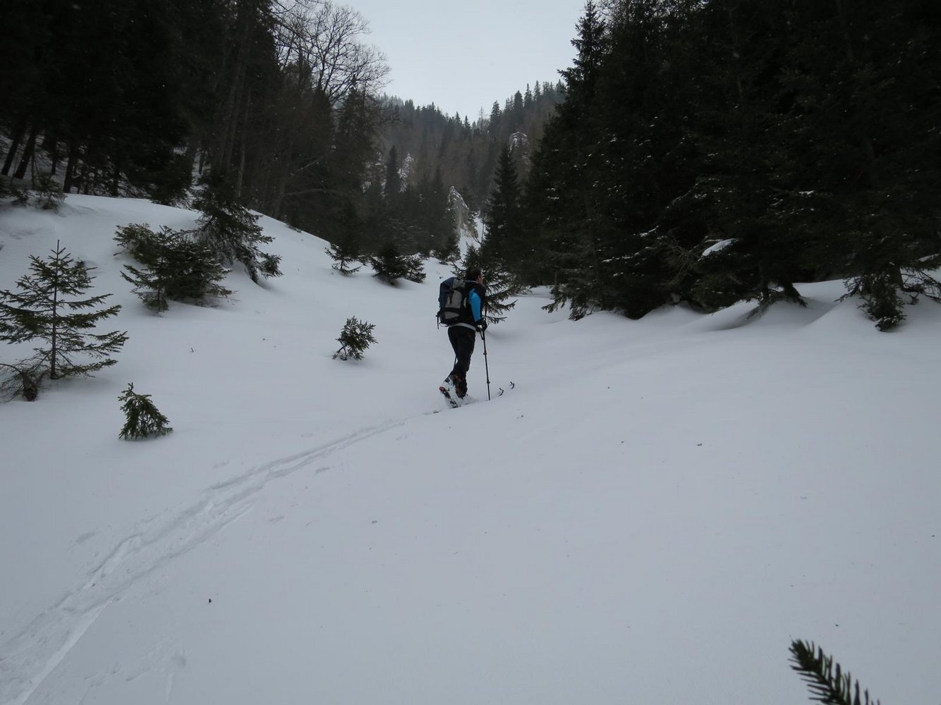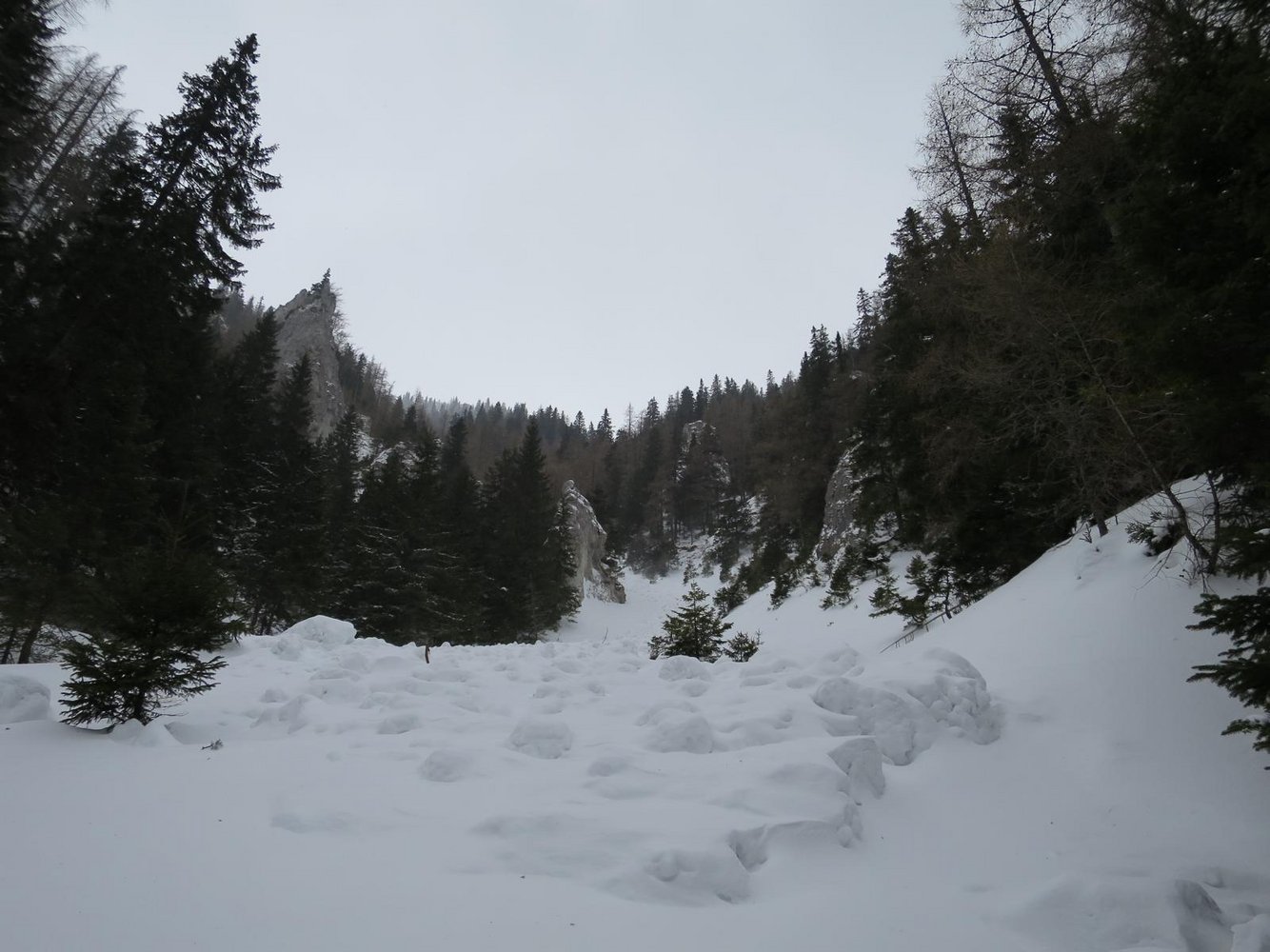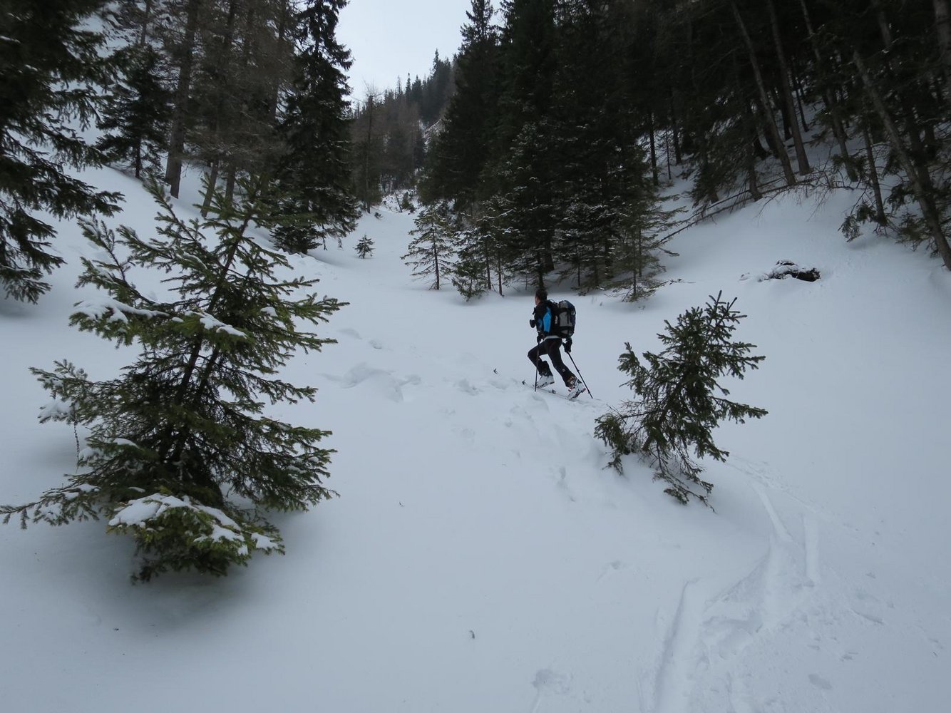 Vorsicht auf Lawinen insbesondere nach starker Erwärmung im engen Graben von den Seitenwänden! Sonst eher nur mittlere Lawinengefahr. Vorsicht jedoch im Gipfelhang!