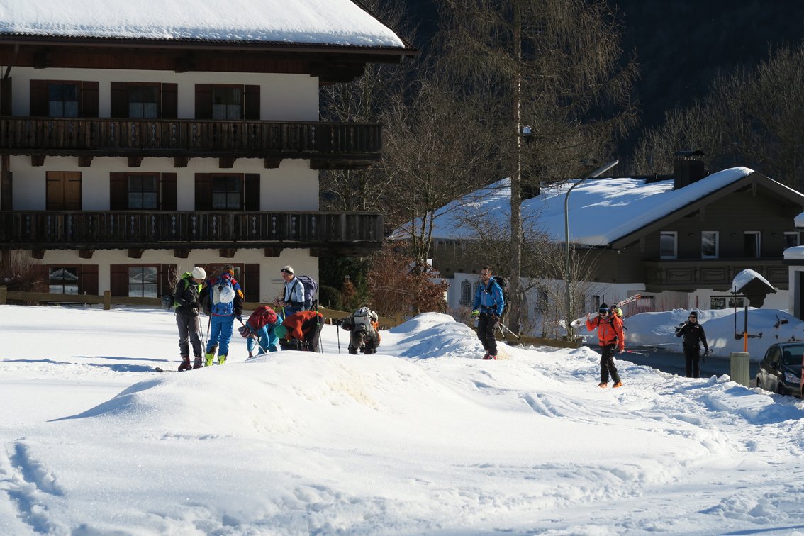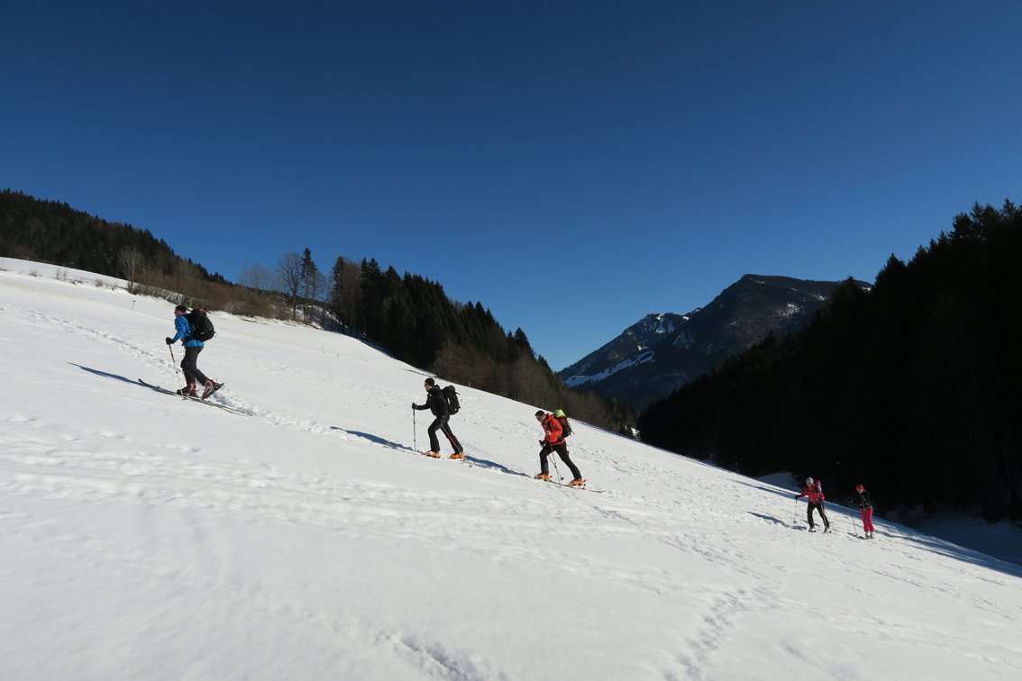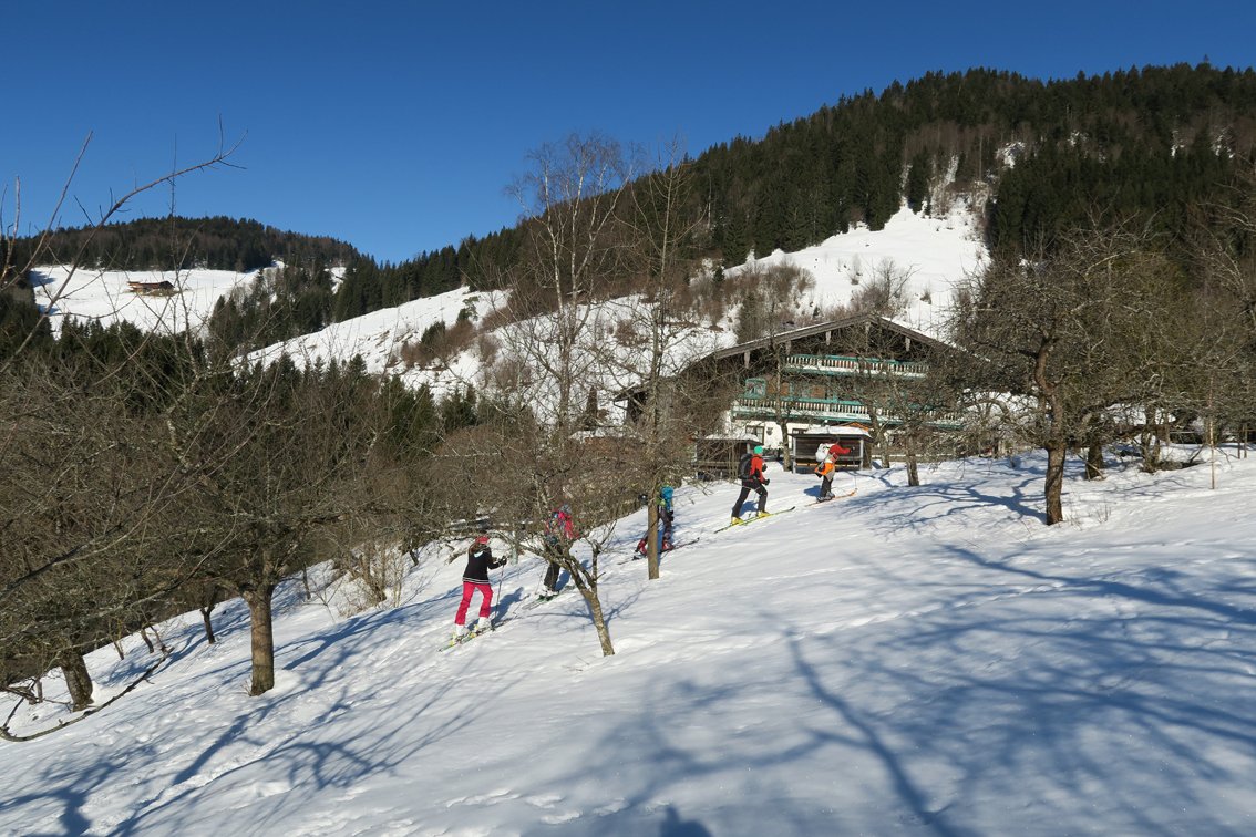 Abfahrt - zuerst im Wald direkt hinunter in Richtung Spitzsteinhaus. Links der Hütte vorbei auf schönen Wiesen an Bauernhöfen vorbei ins Tal. Am Ende auf einem schmalen Ziehweg entlang des Baches zurück zum Parkplatz in Sachrang.