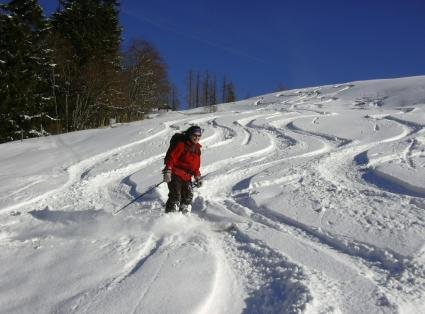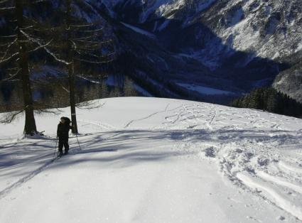 Skitour für Anfänger und Genießer. Die gesamte Abfahrt führt über freie Hänge ins Tal. Traumhaftes Panorama. Sehr gut für Snowboards geeignet. Sehr zu empfehlen bei Neuschnee.