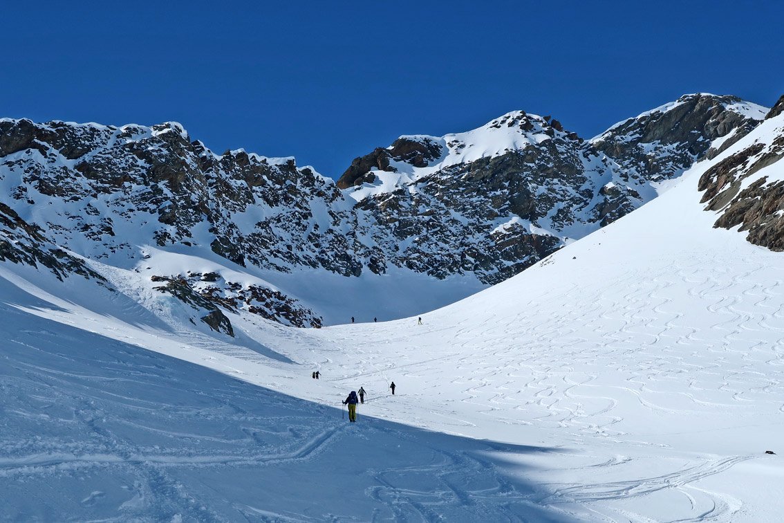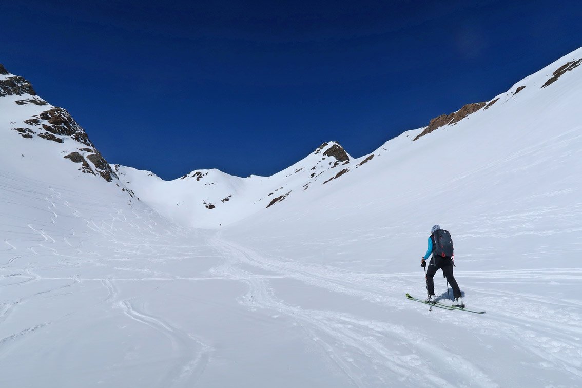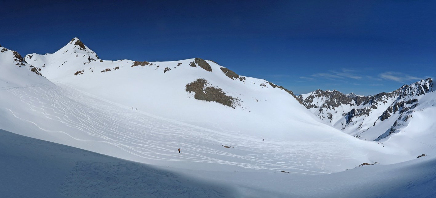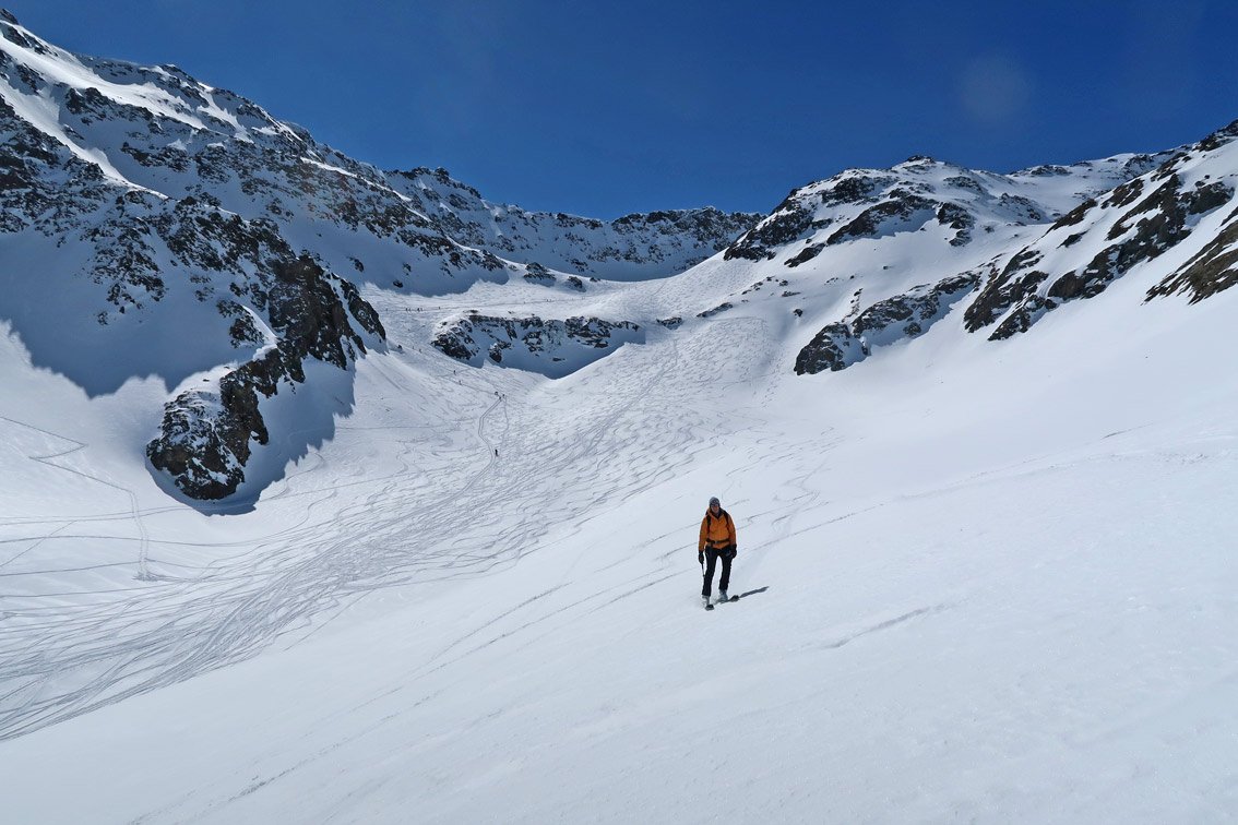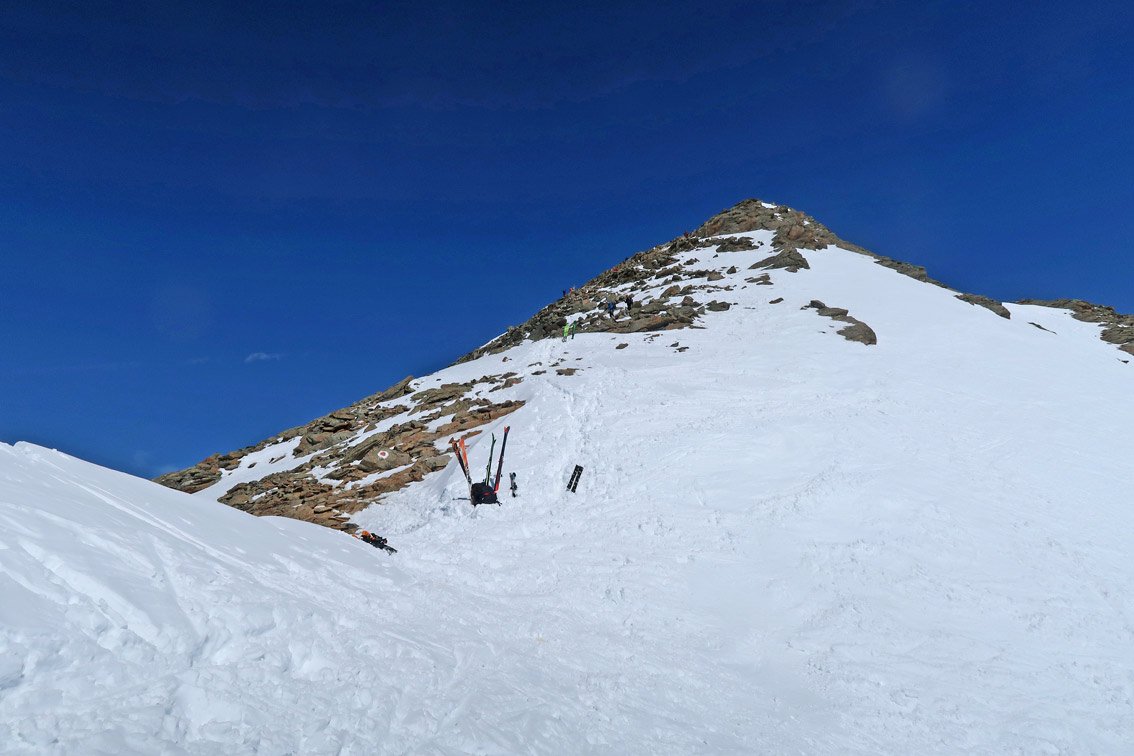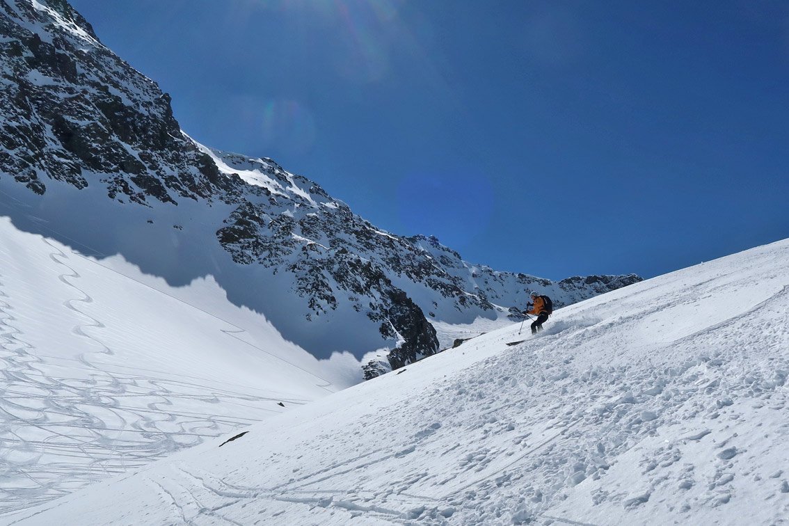 Abfahrt wie Aufstieg. Bei guten Verhältnissen kann man vom oberen Gipfelgrat auch direkt abfahren.