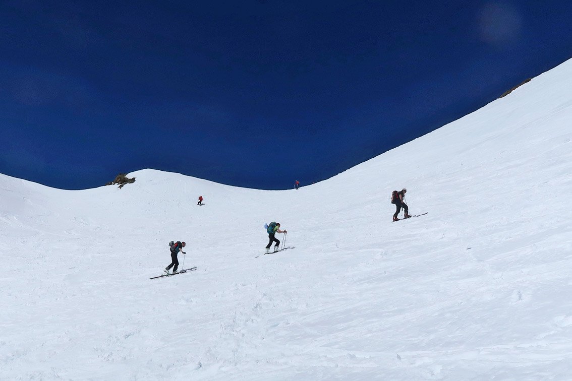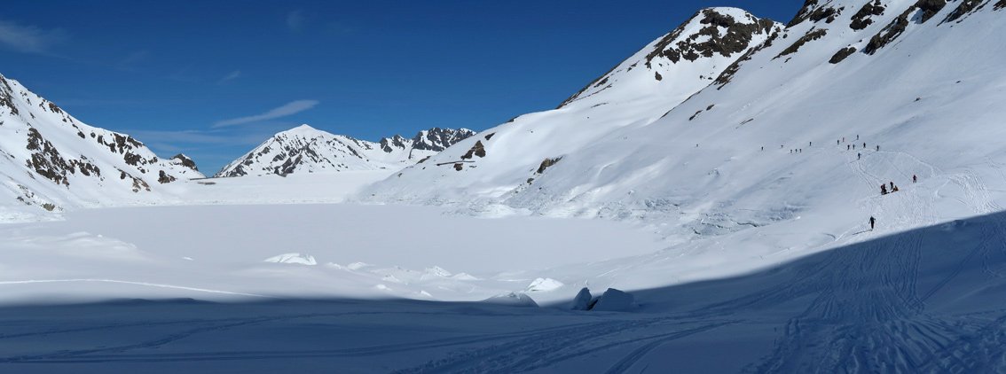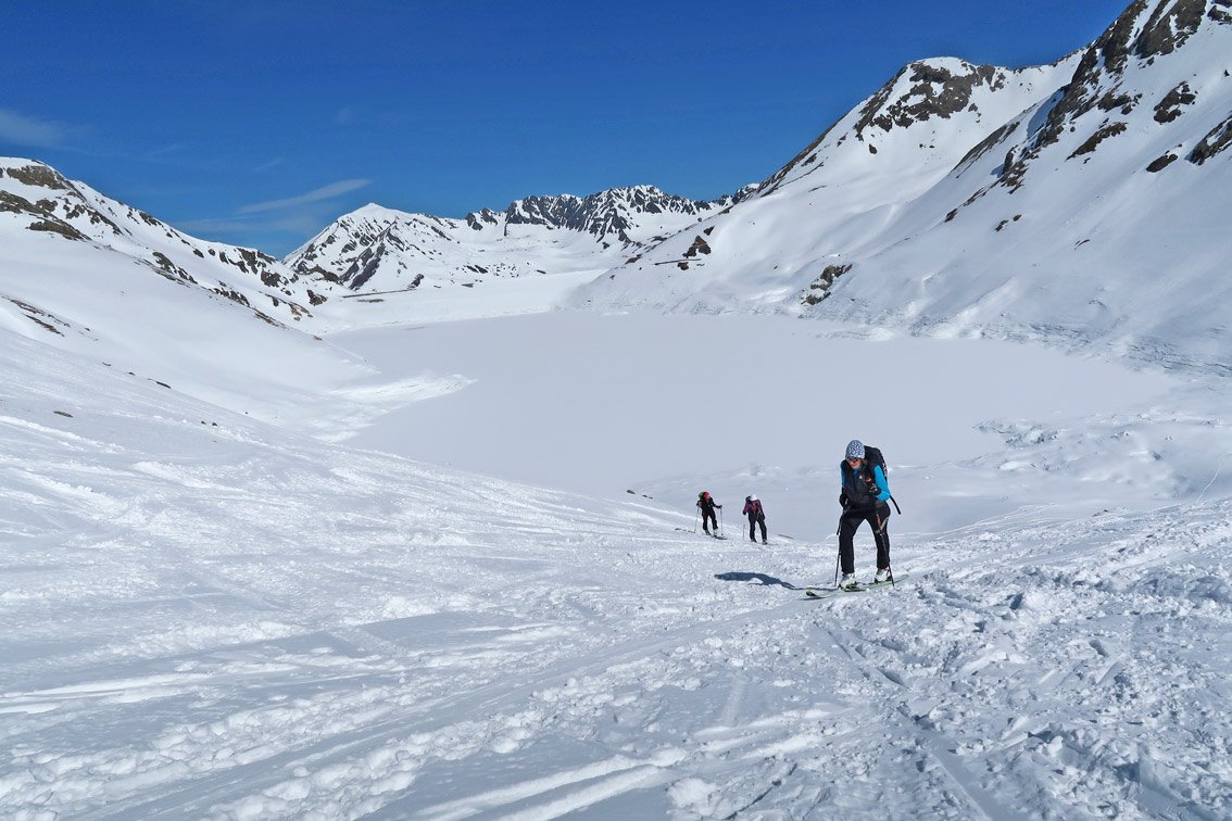 Die Tour wird auch oft von Snowboardern und Schneeschuhgehern gemacht - bei der flachen, aber zum See steil abfallenden Querung tut man sich evtl. mit dem Splitboard etwas schwer. Schneeschuhgeher werden ihr Problem am steilen Hang vor dem Skidepot haben.