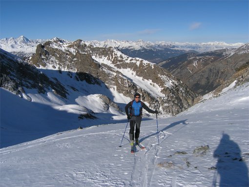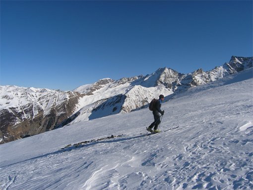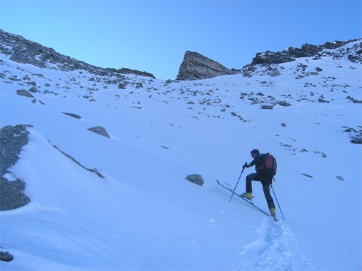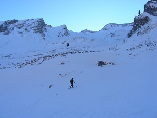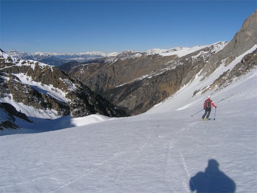 Abfahrt wie Aufstieg. Im großen Kessel zahlreiche Varianten möglich.