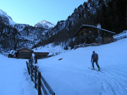 Von den Almhütten in Innervals über die Brücke auf die andere Bachseite. Über eine Wiese erreicht man einen Kahlschlag, über diesen hinauf zur Forststraße und links weiter zur Bloaderalm (1572 m). Von der Alm auf den dahinter liegenden Wasserfall zu und links vom Wasserfall über die sperrende Steilstufe. Nun zuerst weiter in dem engeren Tal bis man oben links in den weiten Kessel gelangt. In diesem je nach Möglichkeit bis man unter dem steilen Schlusshang ankommt. Dort gerade zum Schartl mit Steinmann hinauf - bei sehr sicheren Schneeverhältnissen kann man kurz abfahren und weiter zum Kraxentrager (2999 m) aufsteigen, die ersten 50 Hm von der Scharte sind aber heikel!).