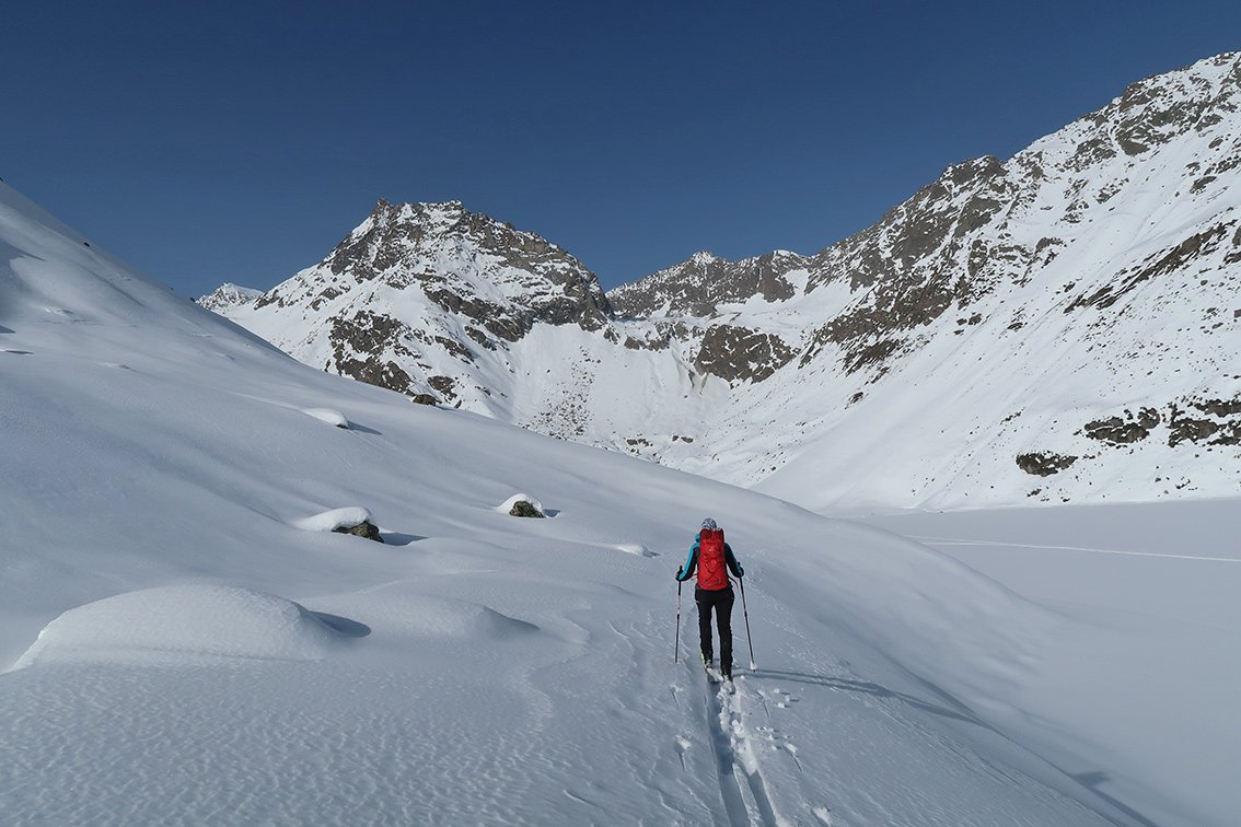 Beim Rifflsee stellt man die Bindung und Skischuhe auf gehen und läuft so ohne Felle über den flachen See bis zur Skipiste.