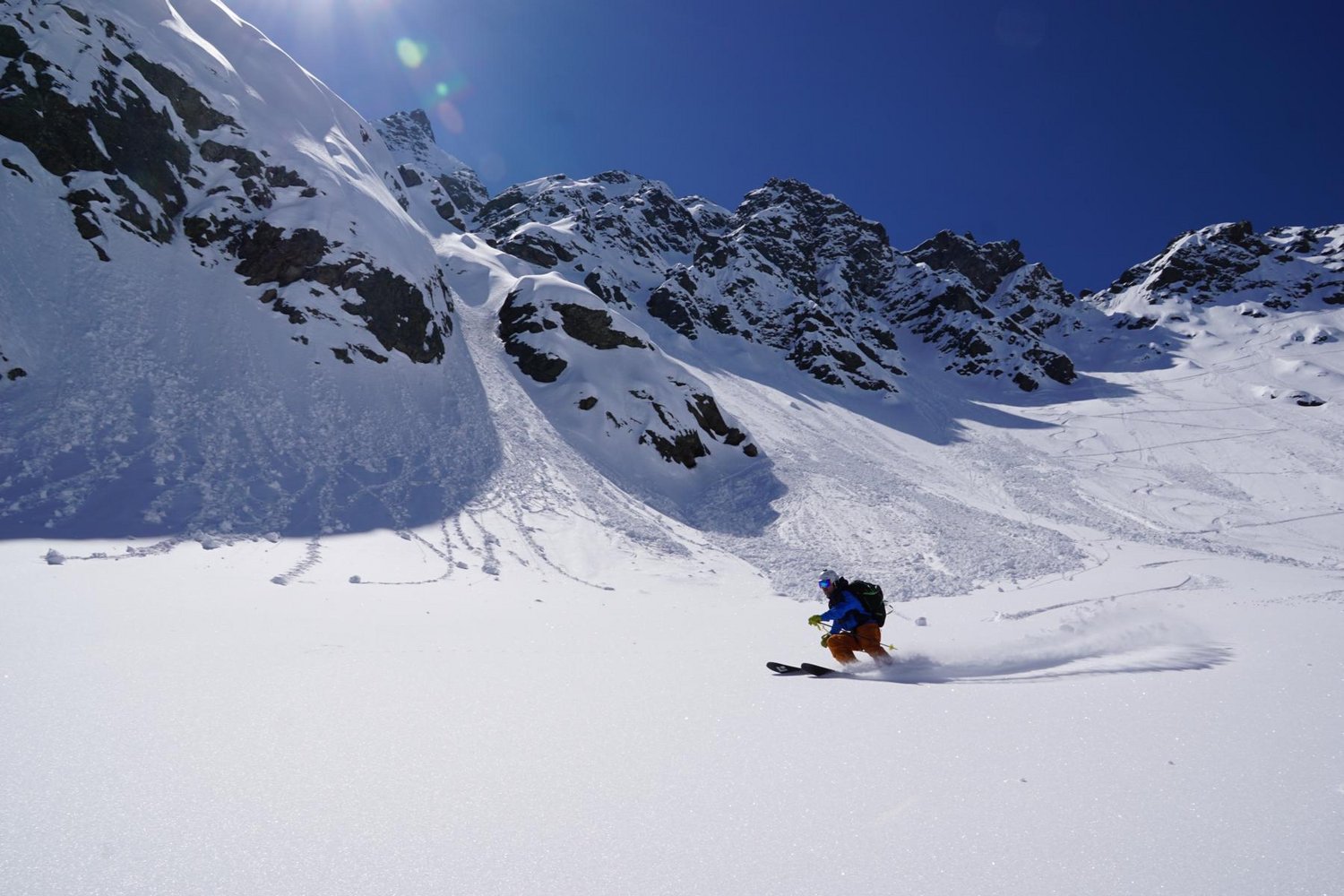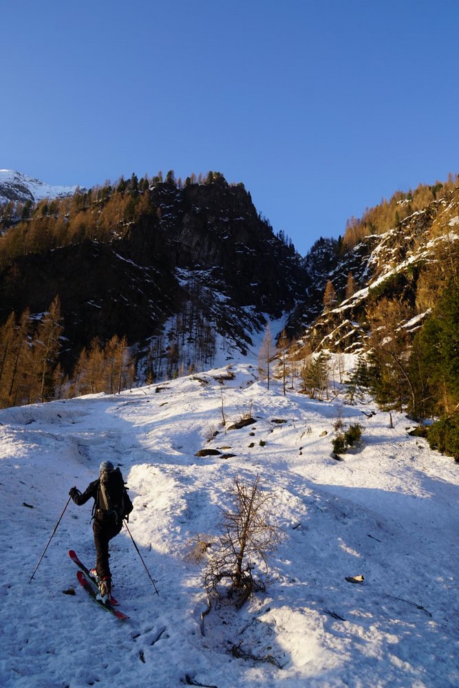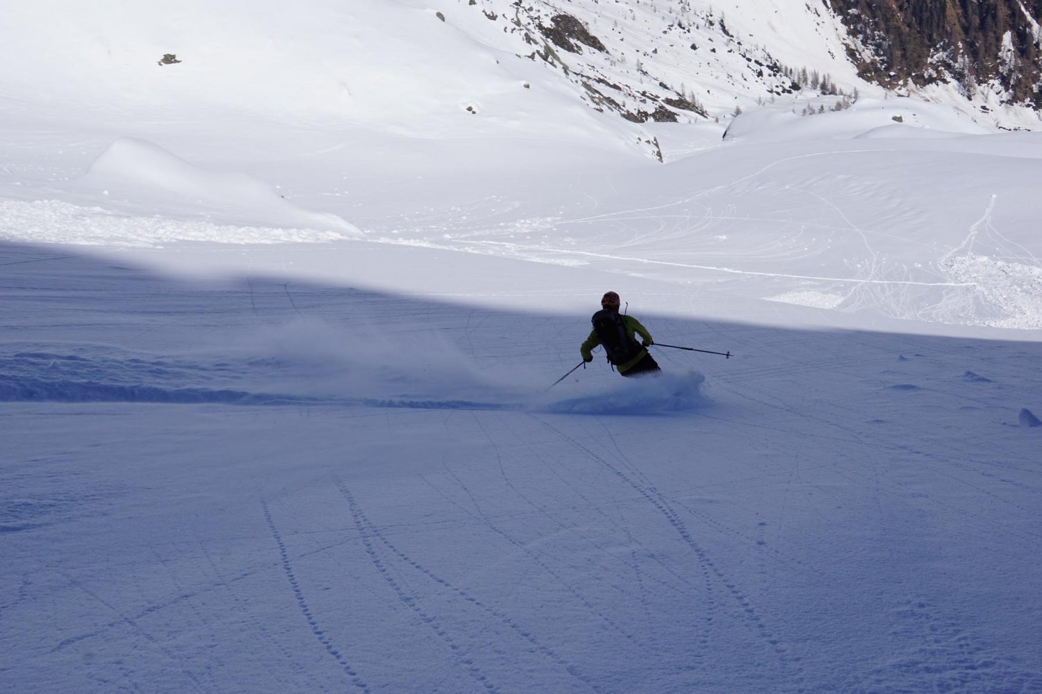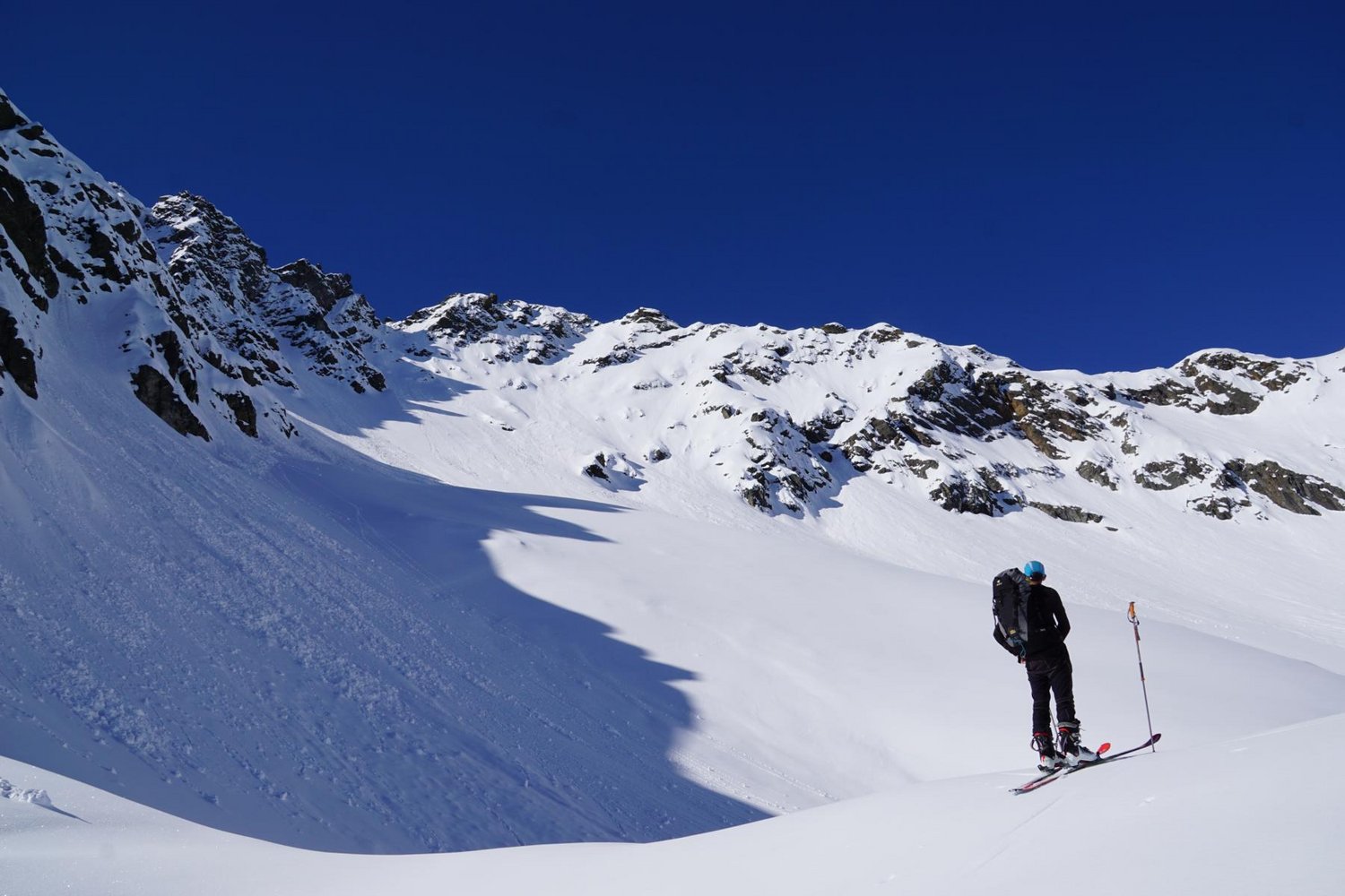 Abfahrt: Von der Scharte durch das Kar hinunter. Ab 2400 Metern wird es etwas felsig, jedoch kann man durch eine etwas steilere Rinne (max. 40 Grad) gut nach unten fahren. Nach der Rinne fährt man nach links in den wunderbaren Hang unter der Himmelwand. Von dort weiter über das freie Gelände Richtung Pußnigalm. Anschließend durch das Tal wieder hinaus zum Auto.