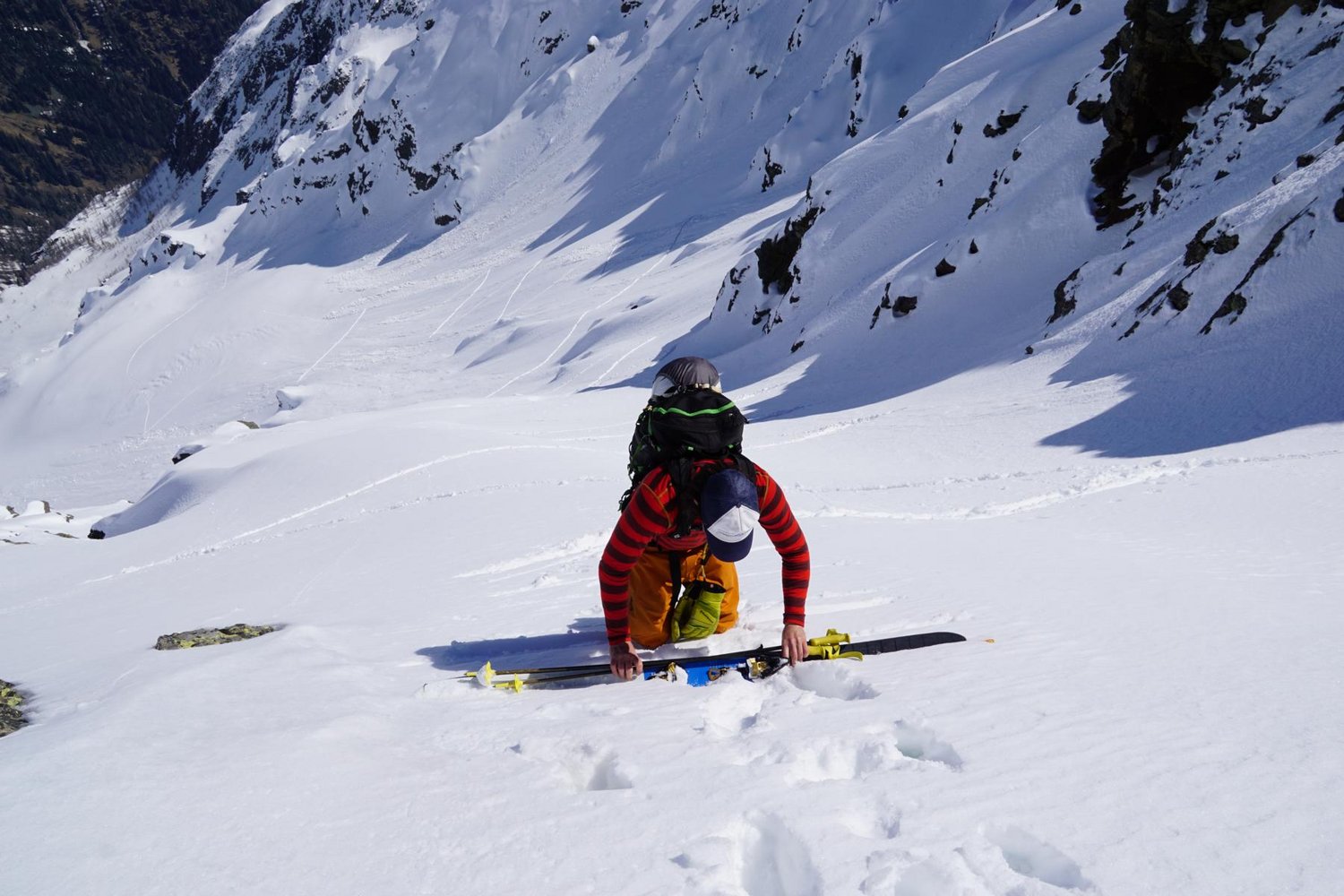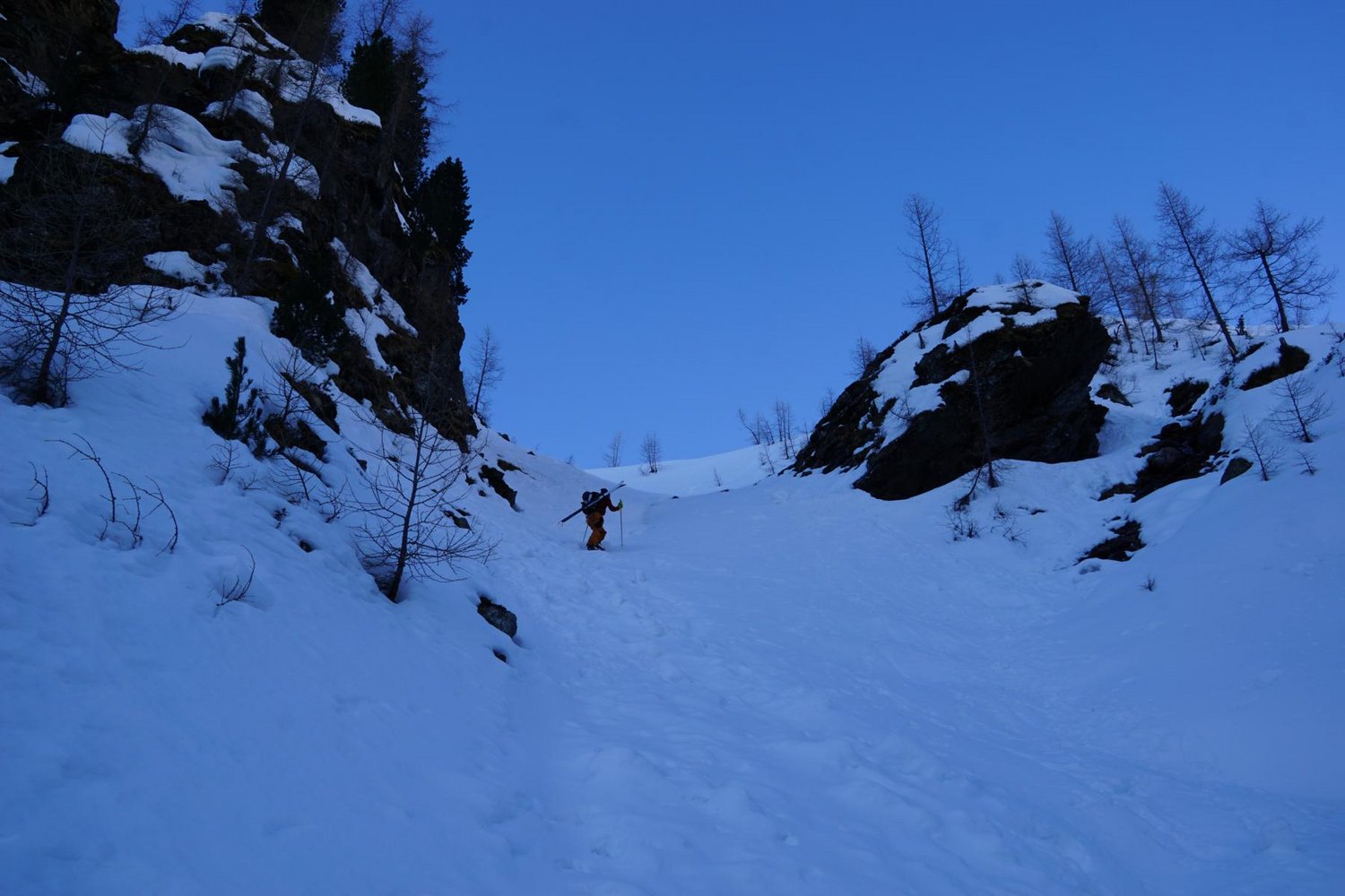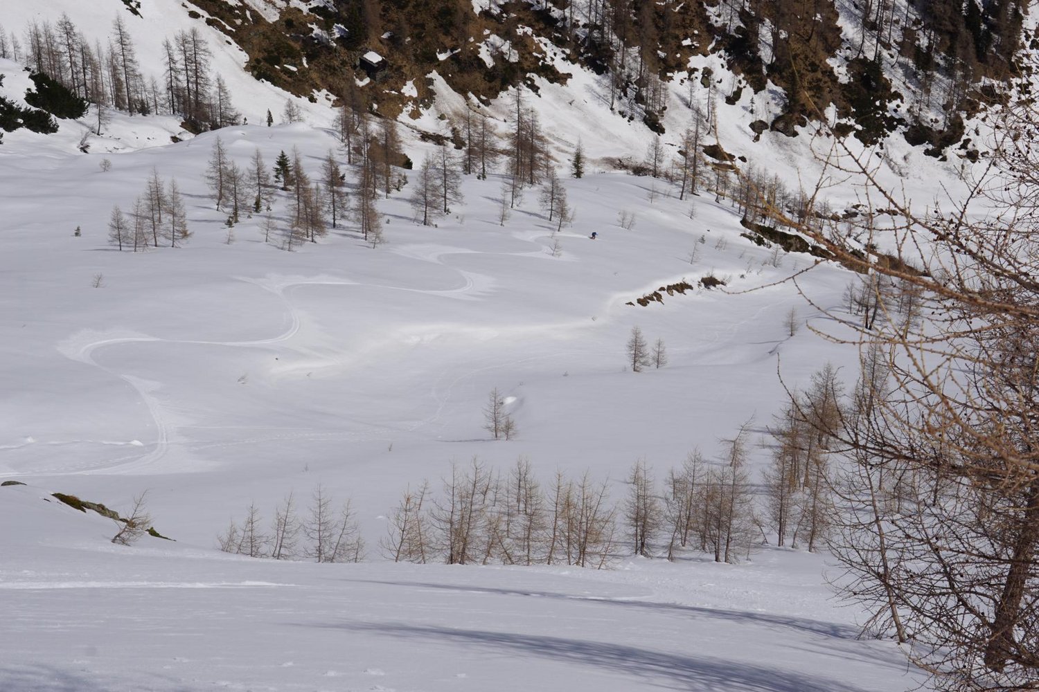 Abfahrt: Von der Scharte durch das Kar hinunter. Ab 2400 Metern wird es etwas felsig, jedoch kann man durch eine etwas steilere Rinne (max. 40 Grad) gut nach unten fahren. Nach der Rinne fährt man nach links in den wunderbaren Hang unter der Himmelwand. Von dort weiter über das freie Gelände Richtung Pußnigalm. Anschließend durch das Tal wieder hinaus zum Auto.
