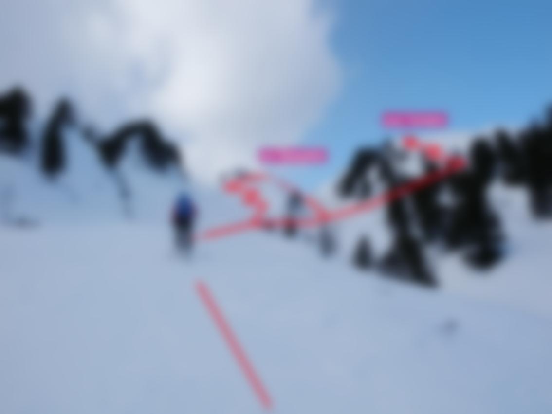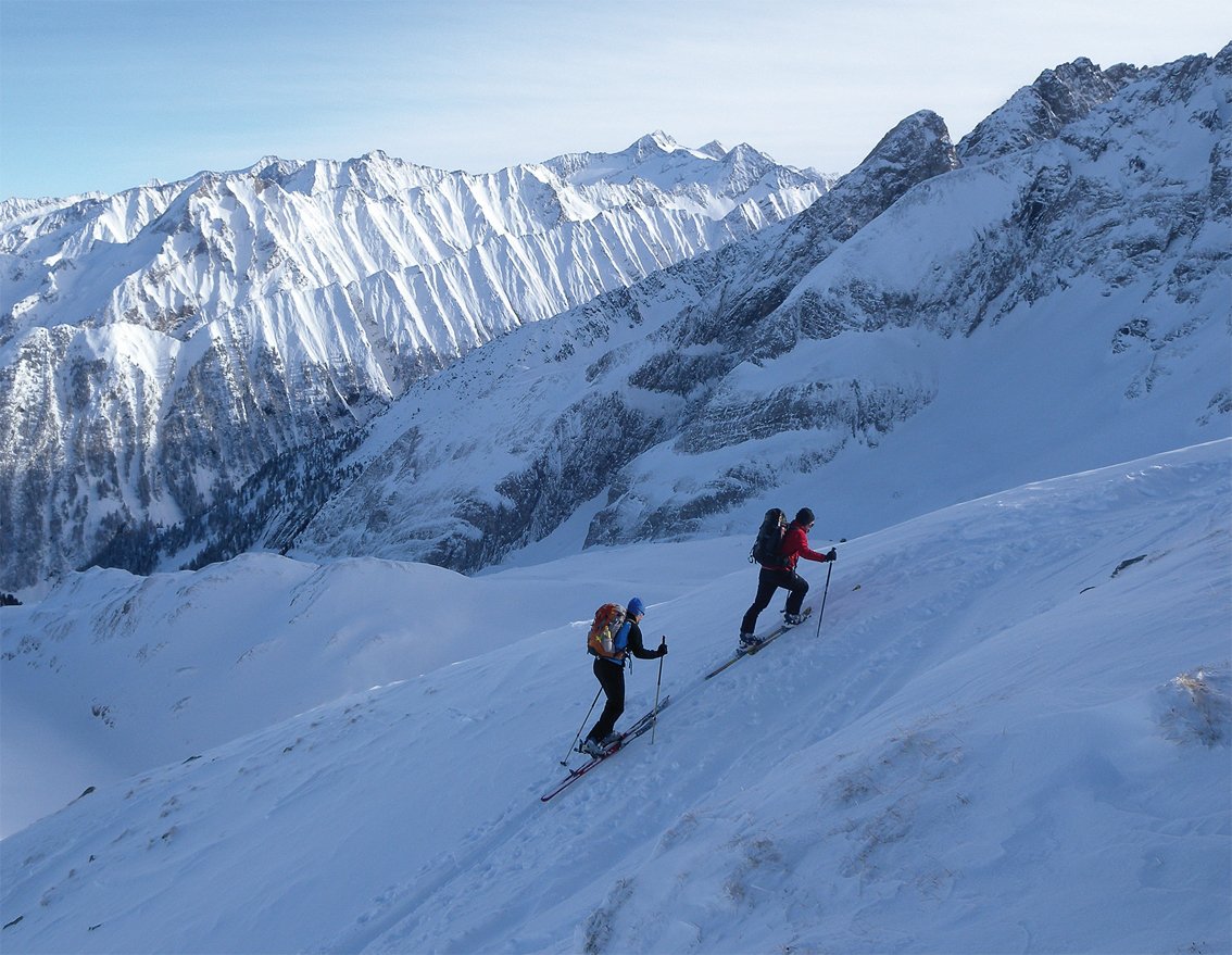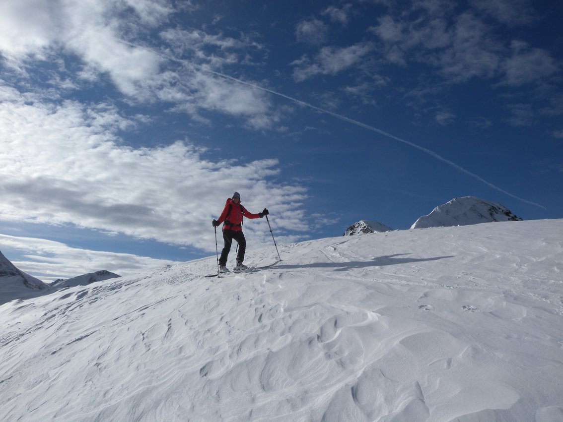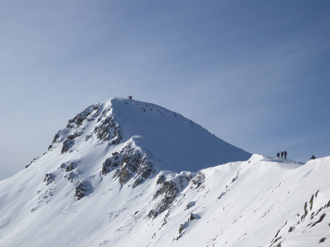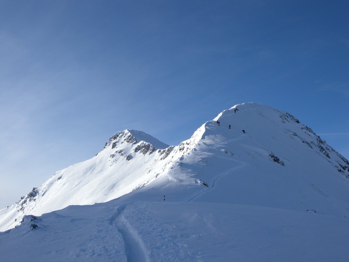 Abfahrt wie Aufstiegsroute. Bei guten Verhältnissen kann man nach dem Gipfelaufschwung rechts, sehr steil (!) in einem Kargraben zur Aufstiegsspur abfahren.
