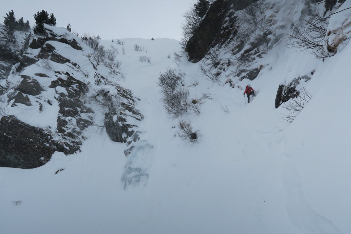Alternativ steile Nordabfahrt (3-4): Den Gipfelhang linkshaltend hinunter, dann nach kurzer Querfahrt zur breiten Rinne (die man sich am besten schon von der Faulbaumgartenalm beim Aufstieg etwas anschaut). Die Rinne hinunter, im Mittelteil ist eine kurze, meist vereiste Steilstufe, die man von oben gesehen links umfährt - dann weiter bis zur Rodelbahn abfahren.