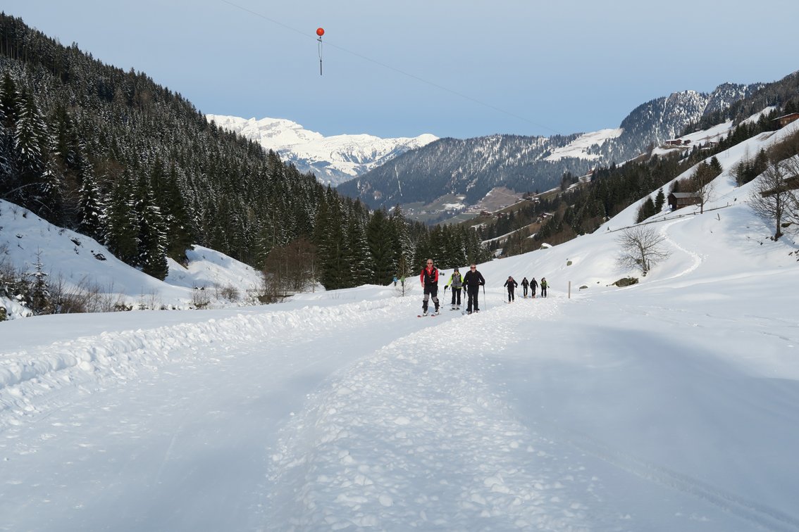Tipp: Wer noch Zeit und Lust hat, fährt am Ende der Rinne links in Richtung Mareitkopf und steigt noch ca. 450 Hm bis zum Gipfel. Vom Gipfel kann man nordseitig wie folgt abfahren: Man folgt dem Gipfelgrat in nördlicher Richtung, kurz vor seinem Ende links zwischen den Bäumen kurz sehr steil hinunter, dann auf dem perfekten Hang hinunter. Kurz vor dem Talgrund nach rechts auf den Wiesen zu einer Hütte und weiter zum Waldrand (Markierung Sommerweg). Auf einem Steiglein durch den Wald, am Schluss muss man ein paar Meter bergauf. Dann wieder auf der Wiese flach zu einer Hütte, dort dann abwärts. Über Wiesenhänge oder die Straße hinunter zum Bach und über die Brücke zum Aufstiegsweg. Infos: Mareitkopf