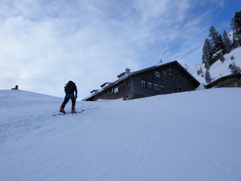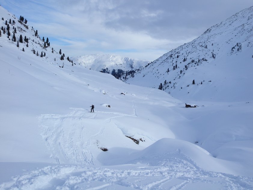 Bessere Variante für die Abfahrt zum Ghf. Wegscheid: Zurück zur Bambergerhütte, dort westlich kurz zum Unteren Wildalmsee aufsteigen (Aufstiegsspur zum Schafsiedel). Vom Unteren Wildalmsee nördlich in das Manzenkar abfahren, unten dann weiter auf dem Forstweg (schönes Augenspektakel - gigantische Eiszapfen direkt am Forstweg).