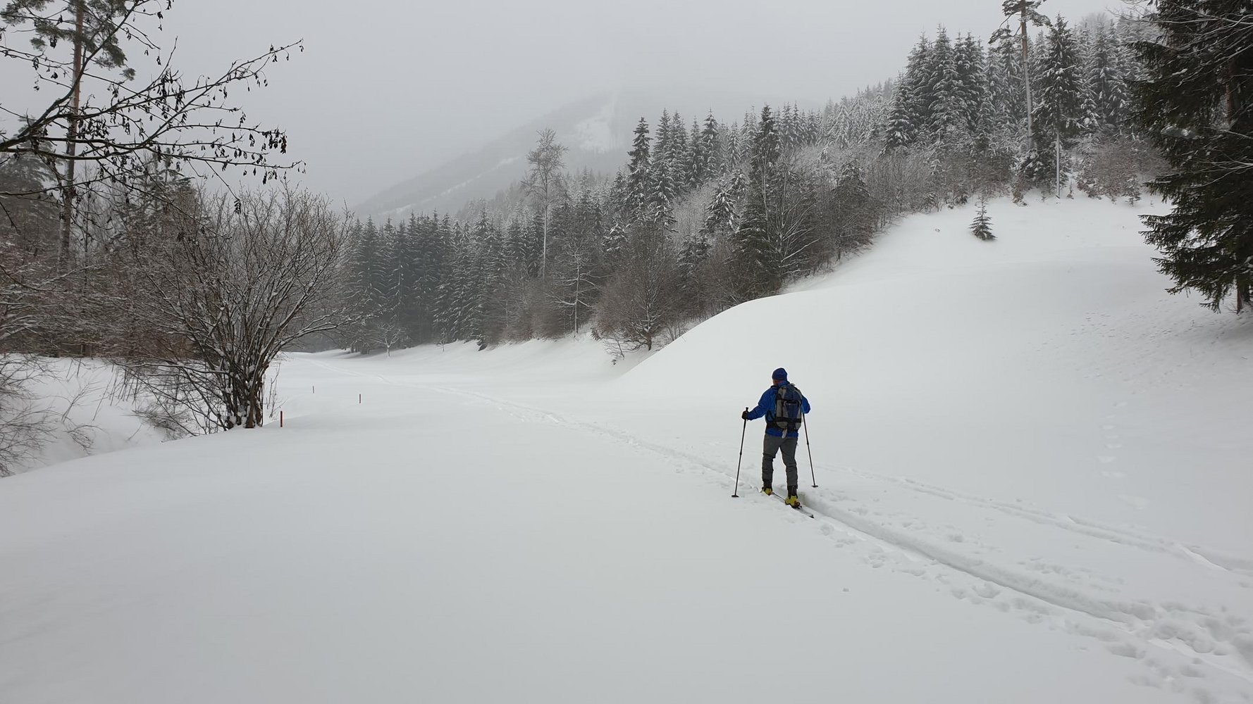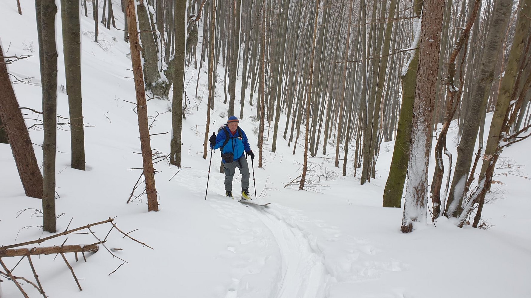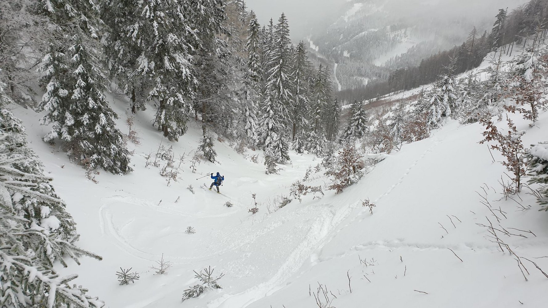 Abfahrt: Zurück zur Bergstation des Schneidlifts und über der Bergstation nach Nordosten auf eine Lichtung, die bald Steiler später zum Graben anfangs weiten Graben wird, abfahren. Diesen unten enger werdenden Graben bis zur 4ten Forststraßen-Kreuzung folgen. Ab hier führt die Forststraße nach Norden aus dem Graben. Bei wenig Schnee kann man schon auf ab 800 m auf der Forststraße bleiben.