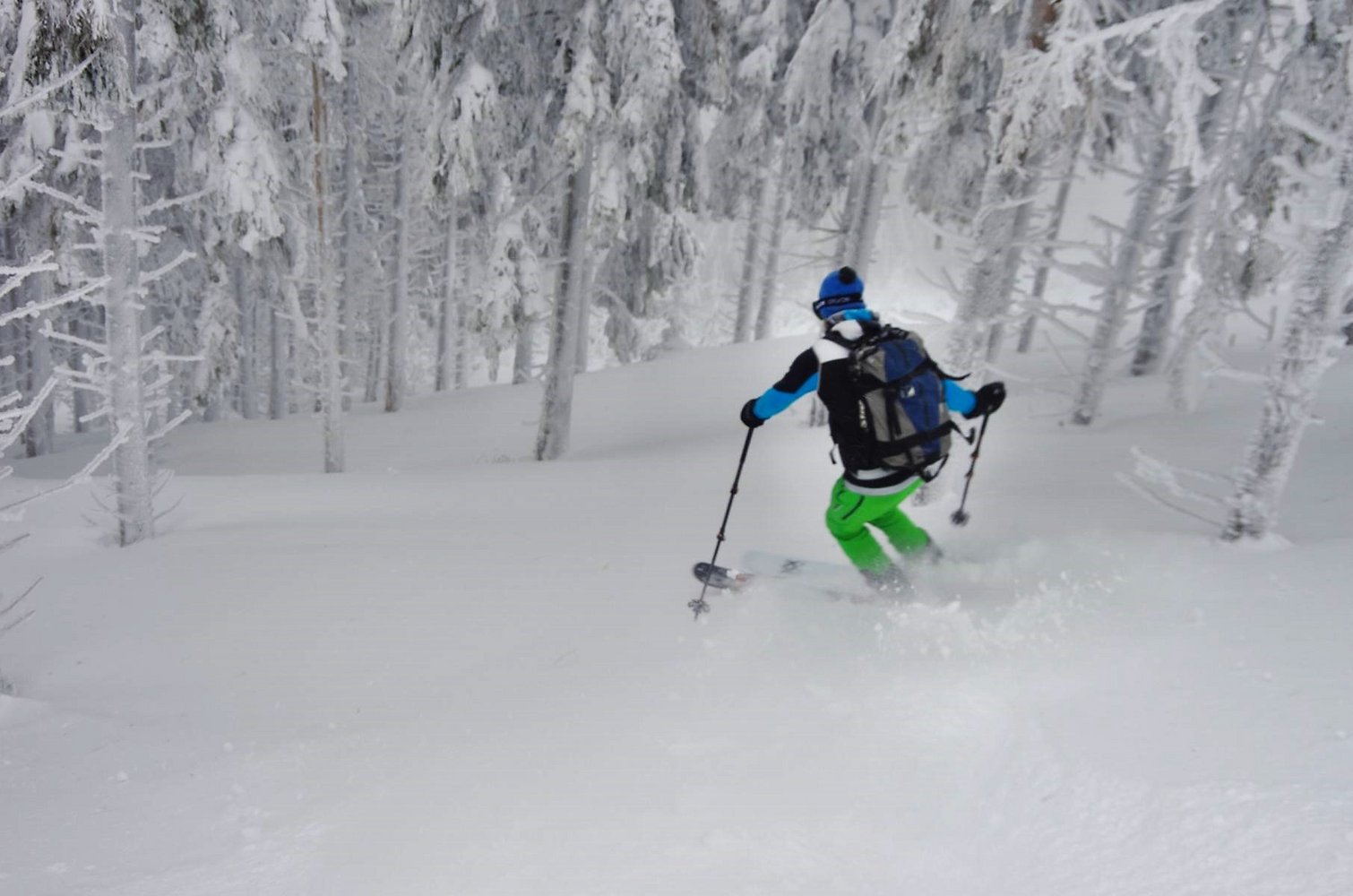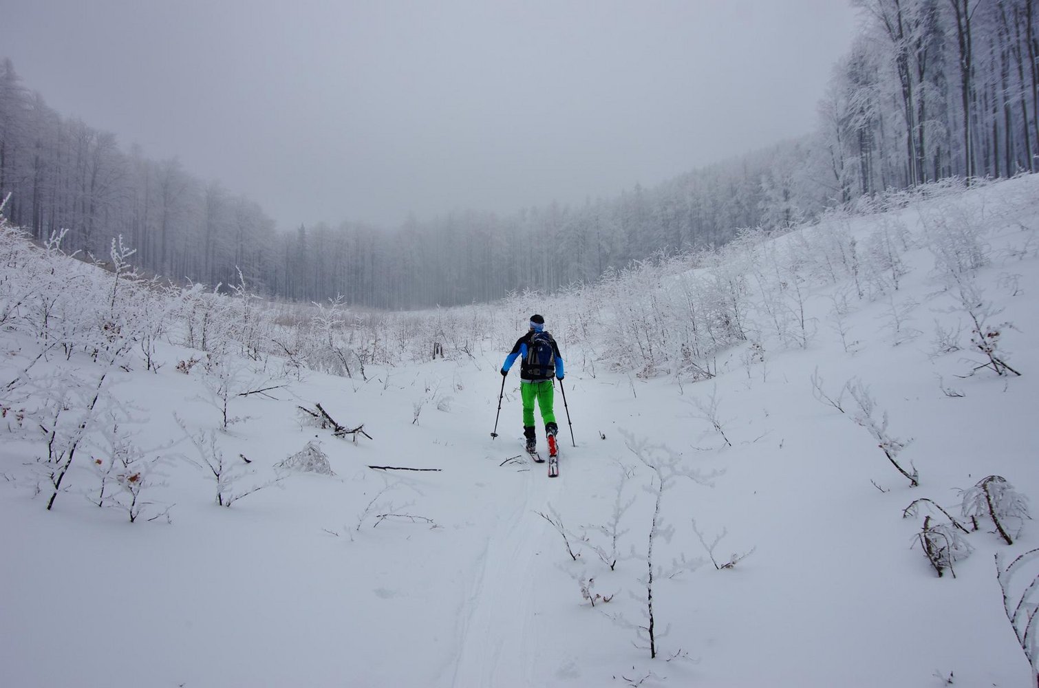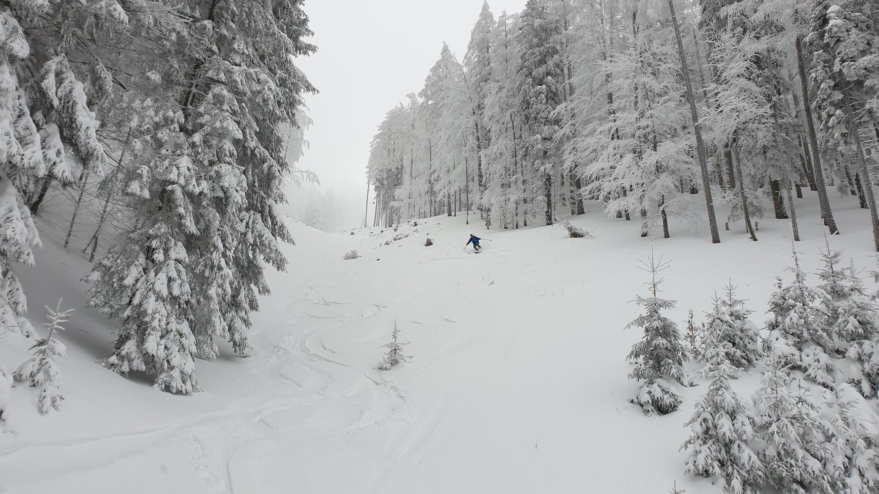 Abfahrt: Zurück zur Bergstation des Schneidlifts und über der Bergstation nach Nordosten auf eine Lichtung, die bald Steiler später zum Graben anfangs weiten Graben wird, abfahren. Diesen unten enger werdenden Graben bis zur 4ten Forststraßen-Kreuzung folgen. Ab hier führt die Forststraße nach Norden aus dem Graben. Bei wenig Schnee kann man schon auf ab 800 m auf der Forststraße bleiben.
