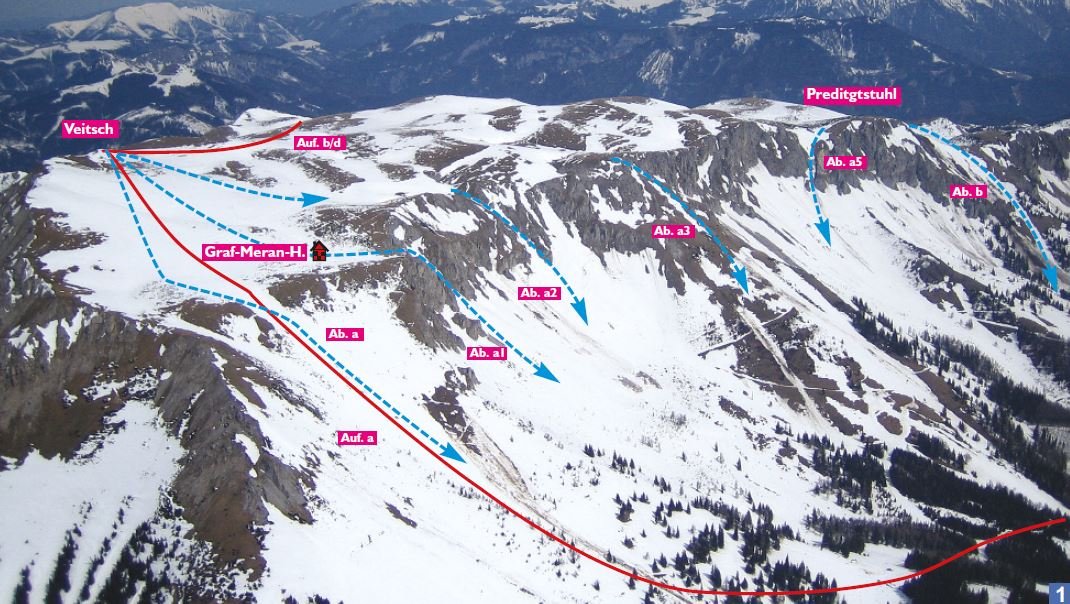 Abfahrt wie Aufstieg oder bei unsicheren Verhältnissen über die Schaller Rinne (Graf Meran Haus) abfahren.