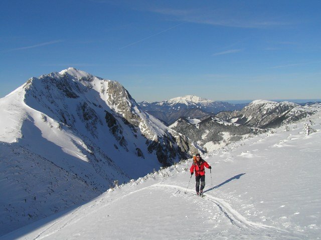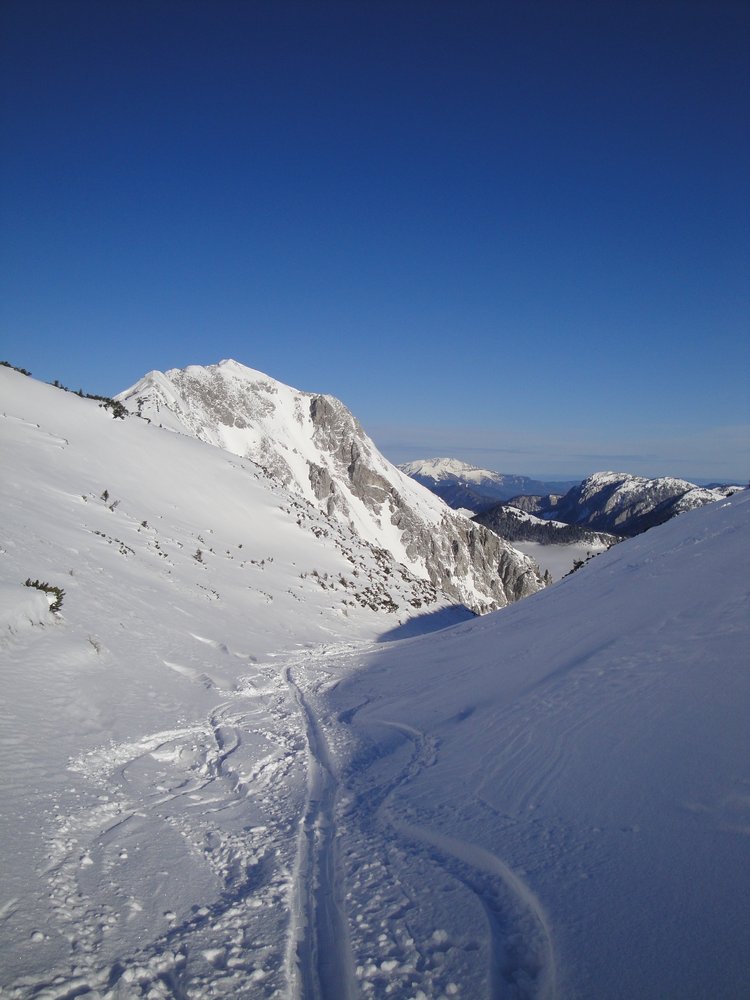 Relativ lange und beliebte Skitour auf die Veitsch. Die Route verläuft zuerst ueber eine Forststrasse, später dem Wanderweg 465 folgend durch den Veitschalmgraben. Nach einem Flachstück kommt eine kurze Unterbrecherstelle, die am linken Rand ueber einen Miniklettersteig überwunden wird. Weiter, immer im Graben, bis auf das Veitschplateau und der Stangenmarkierung nach rechts bis zum Gipfel folgen. Abfahrt wie Aufstieg. Miniklettersteig kann bei viel Schnee von oben kommend links (kleine Stangenmarkierung) umfahren werden.
