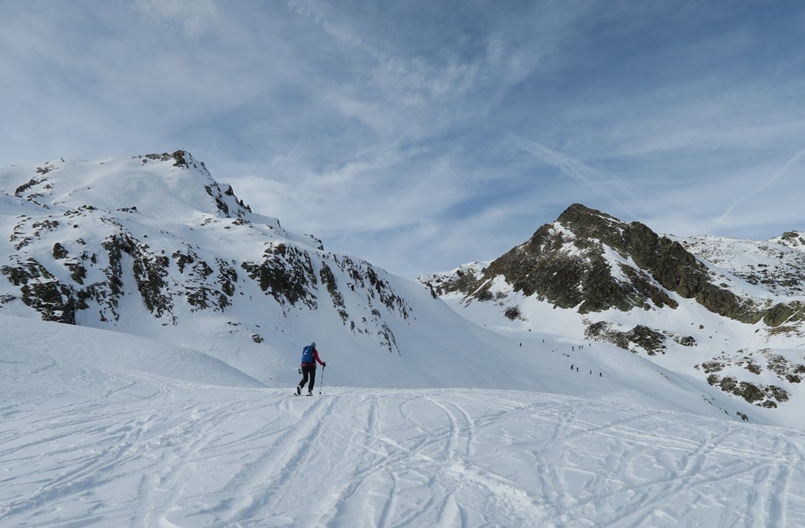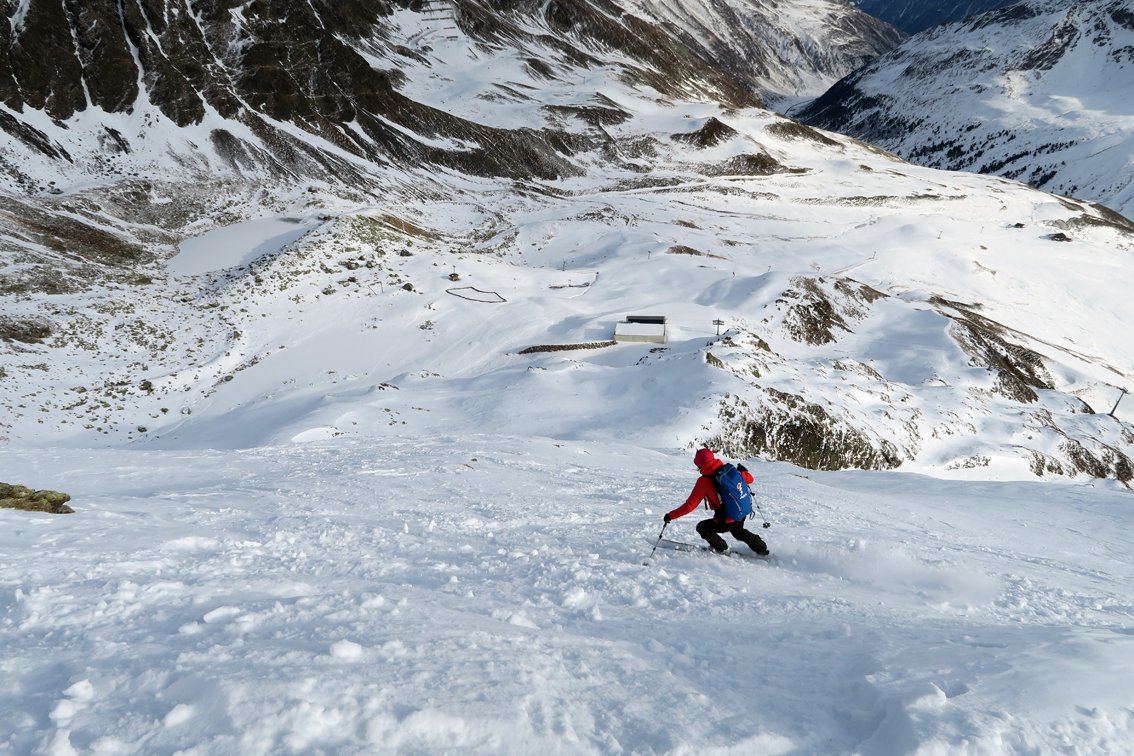 Abfahrt wie Aufstieg. Bei guten Verhältnissen kann man auch direkt hinunter fahren und braucht nicht mehr zurück zur Mulde mit dem kleinen See.