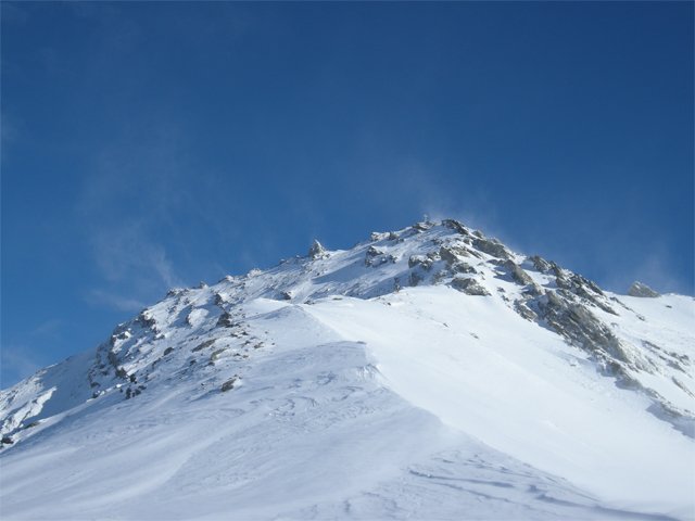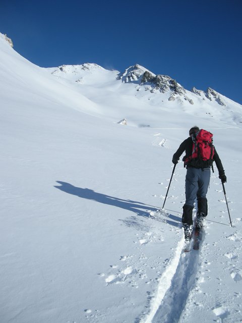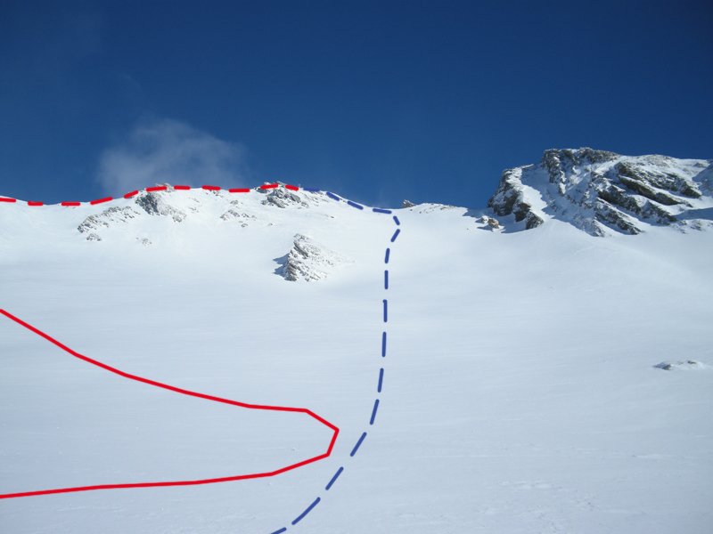 Bei Lawinengefahr den Südhang meiden und über den Südwestgrat abfahren.