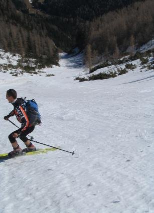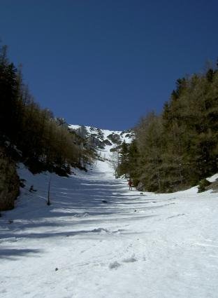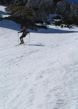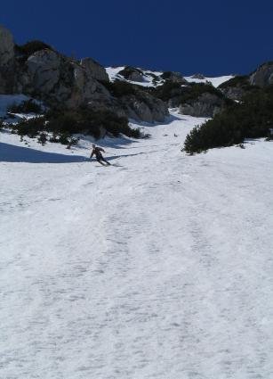 Entweder vom "Hotel Hochschneeberg" querend in die Flanke oder direkt von der Hochfläche (40°-44°). Beliebig durch einige kleine Engstellen in die breite Flanke unterhalb der Felsen. Die nun breite Rinne abwärts, die sich in der Waldzone verengt bis zu einem Felsabbruch (1325m). Unmittelbar vorher orografisch rechts weg und eben ca. 100 m zur roten Markierung des unteren Herminensteiges. Querung bis zur "östlichen Hotelries". Von dort entweder den nachfolgenden Felsabbruch abklettern oder rechts umgehen (rot markiert). Weiter durch den Wald ins Mieseltal bis ins Schneebergdörfl.