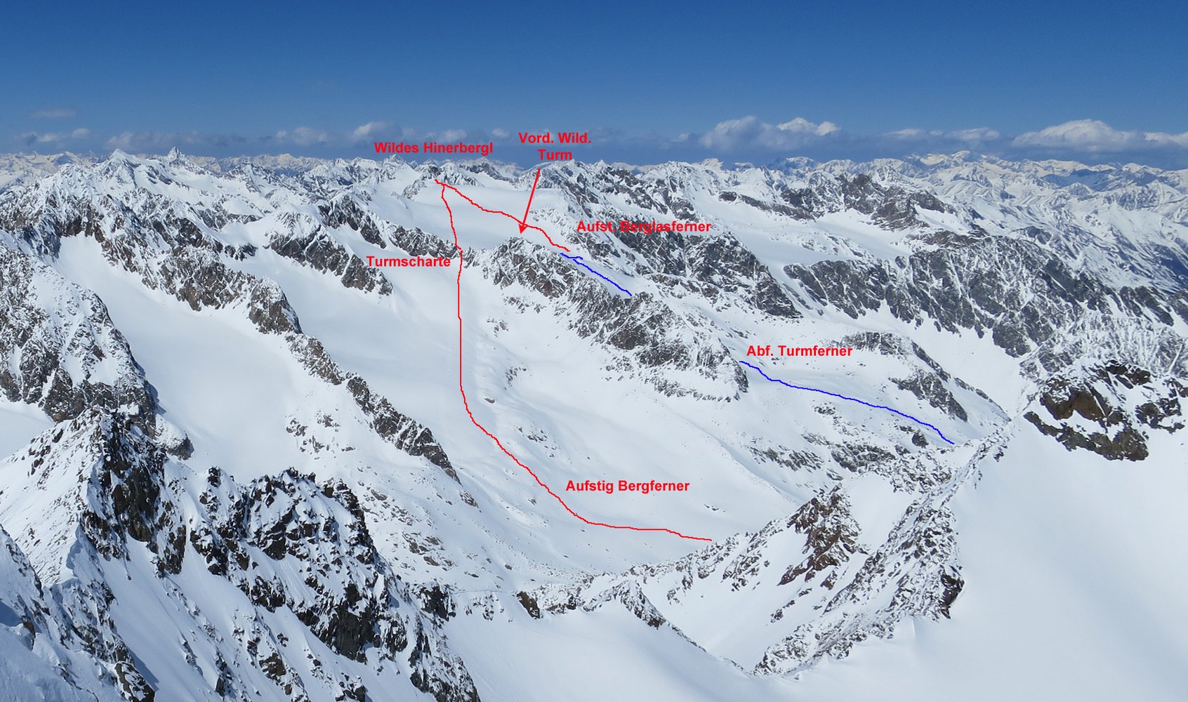 Zur Turmscharte und zum Vorderen Wilden Turm (3177 m) aufsteigen und auf dem Rücken zwischen Turm- und Berglassferner kurz abfahren und dann nach rechts in den unten flachen Kessel des Turmferners. Am Ende des Kessels steiler und schließlich rechtshaltend hinunter zum Alpeiner Bach und zur Franz Senn Hütte.