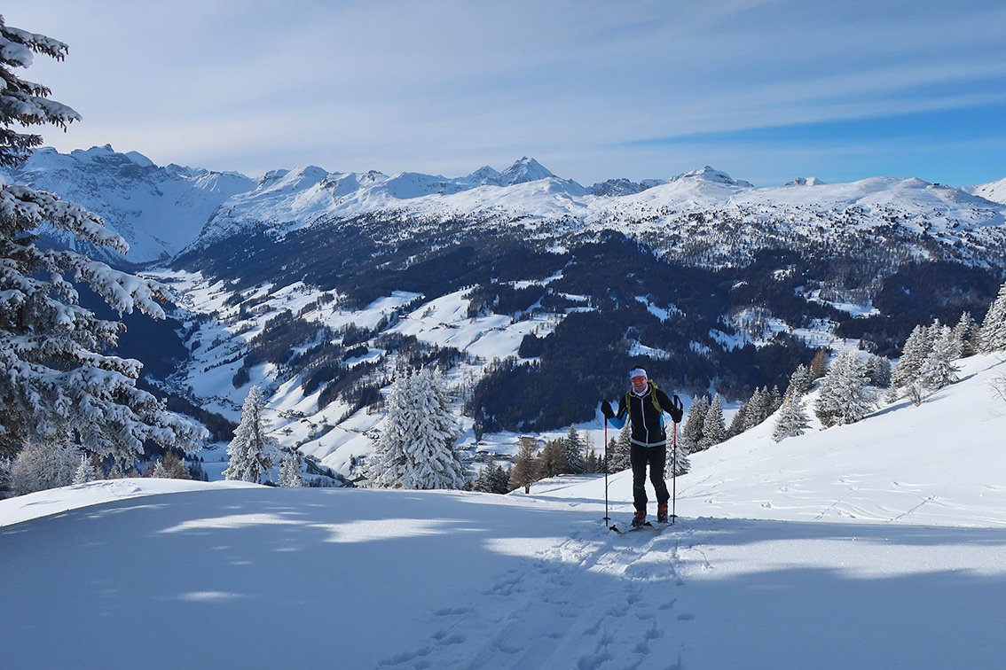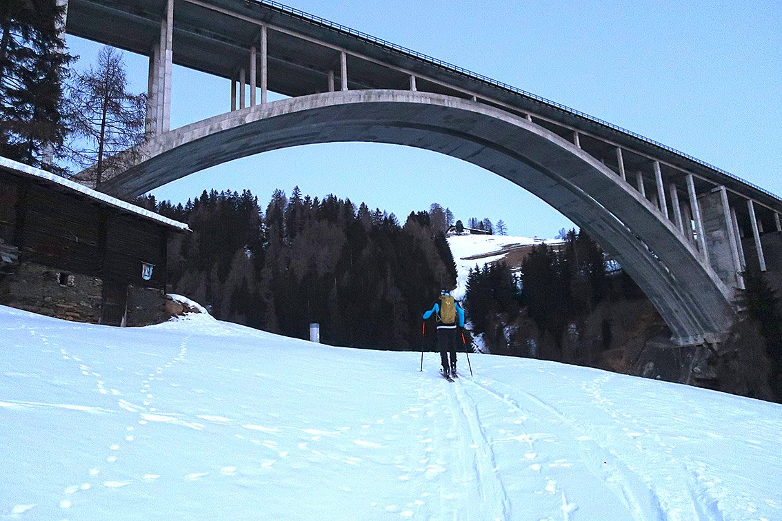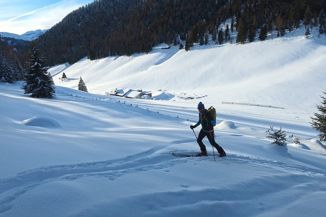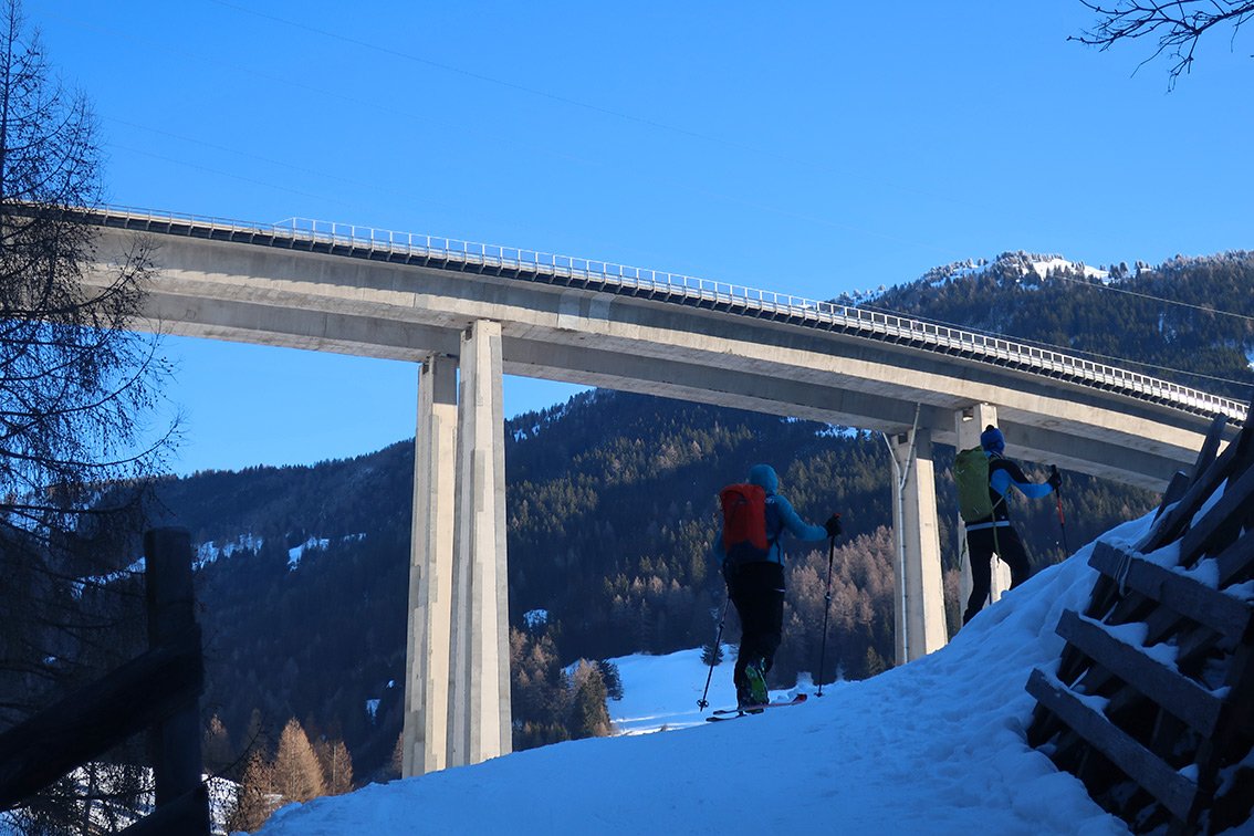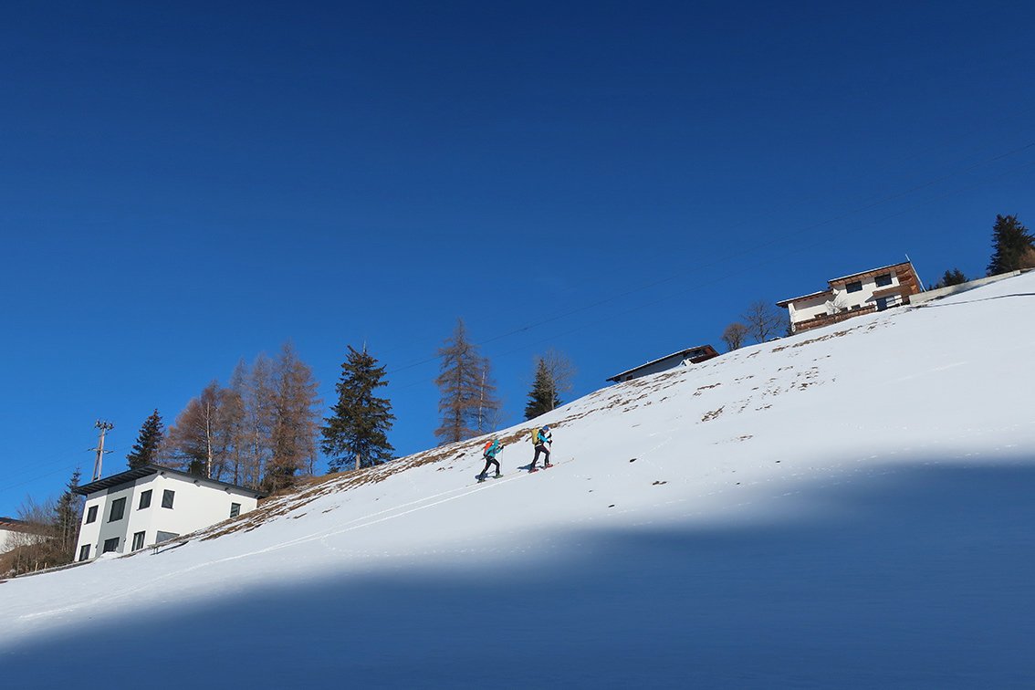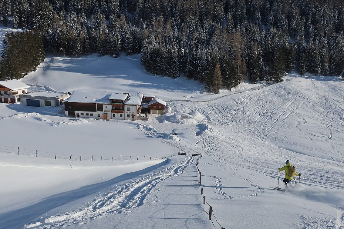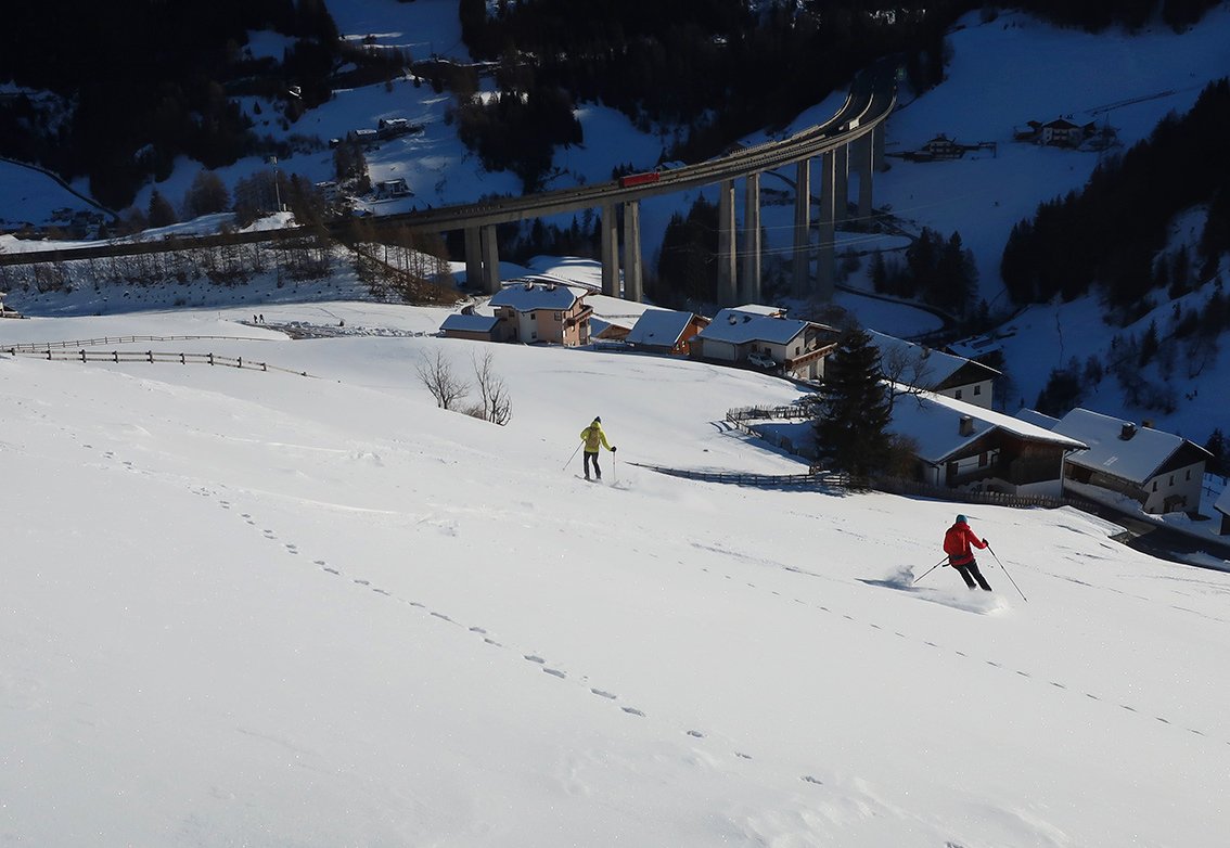 Paudauner Kogel (2066 m): Auf der anderen Straßenseite steigt man auf Wiesen hinauf zur Bahnstrecke und überquert diese auf einer Brücke. Weiter auf Wiesenflächen leicht links haltend (oben durch Wald) zu einem Forstweg. Ab dort dann im Bereich des Weges Nr. 82 (der den Forstweg abkürzt) hinauf zur Freifläche der Padauner Mähder. Dort nach links auf dem sehr breiten Rücken zum Gipfel des Padauner Kogels (2066 m). Wieder auf dem Rücken zurück, dann weiter in südlicher Richtung auf dem Weg Nr. 83 in Richtung Padaun abfahren. Ab einer kleinen Material-Seilbahn-Bergstation fällt der meist von Schneeschuhgehern gespurte Weg steil im Wald ab (etwas mühsam abzufahren) - die letzten Meter schwingt man aber wieder auf einer schönen Wiese zum Larcherhof.