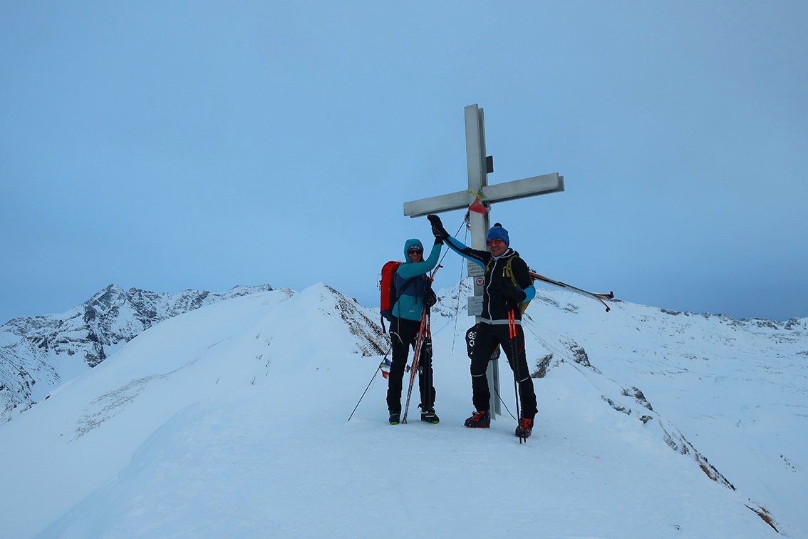 Wir haben in gemütlichem Bergführer-Tempo, bei besten Verhältnissen (alles war gespurt) 10:43 gebraucht und 11 Stunden als Zeitwert ausgegeben. Bei schlechten Verhältnissen (Schneefall, schlechte Sicht, keine Spur, starker Wind etc. kann es natürlich deutlich länger dauern).