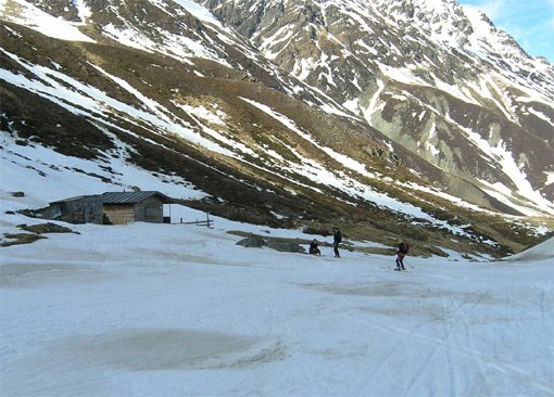 Normale Skitourenausrüstung, auf jeden Fall Harscheisen für die oft vereiste Steilstufe der "Zwing" (evtl. könnten auch Steigeisen nötig sein).