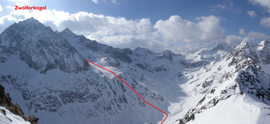 Sehr steile Skitour auf den Zwölferkogel. Die Tour hat drei steile Abschnitte, eine Steilstufe in das Zwölferkar, das Ende des Kares bis zur Scharte und der Gipfelhang. Die Tour ist sicher keine Standardskitour, wegen der steilen Hänge und des doch sehr schönen Aussichtsgipfels aber nicht unlohnend. Bei sehr sicheren Schneeverhältnissen ein kleines Abenteuer.